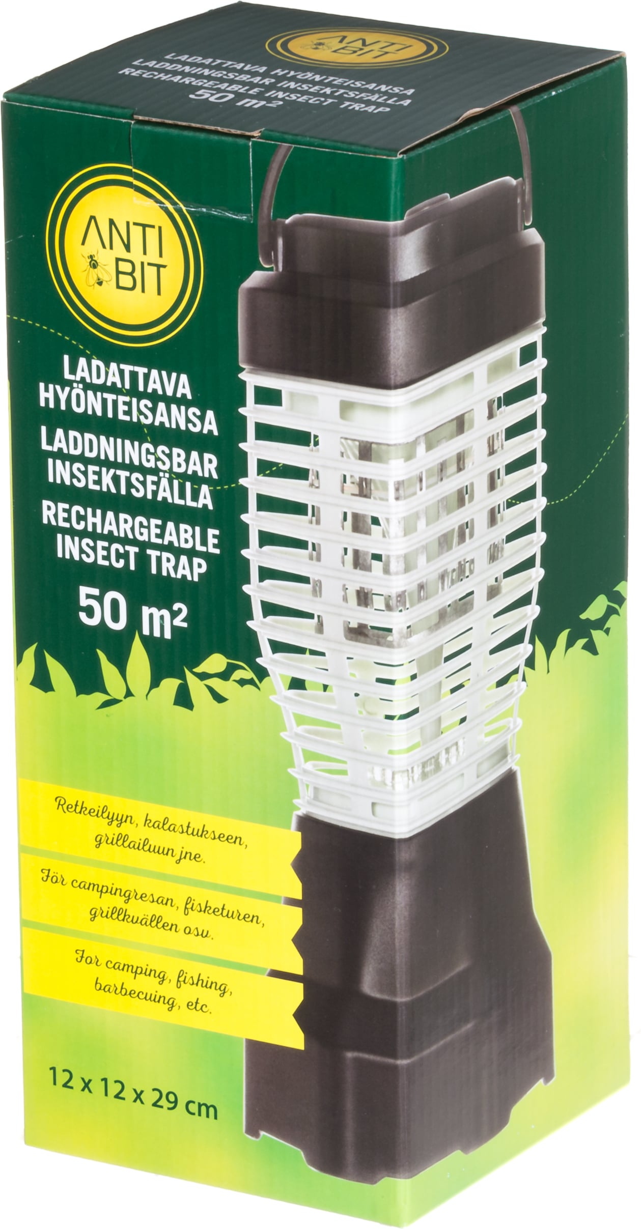 Antibit Ladattava hyönteisansa 50 m². Hyönteisansa sisä- ja ulkokäyttöön. Vaikutusalue n. 50 m². Voidaan käyttää myös kannettavana retkivalona tuotteeseen sisältyvien valkoisten ledien ansiosta. UV-A ledit houkuttelevat lentäviä hyönteisiä ansaan, joka tappaa hyönteiset sähköiskulla. Sisältää kantokahvan sekä puhdistusharjan.