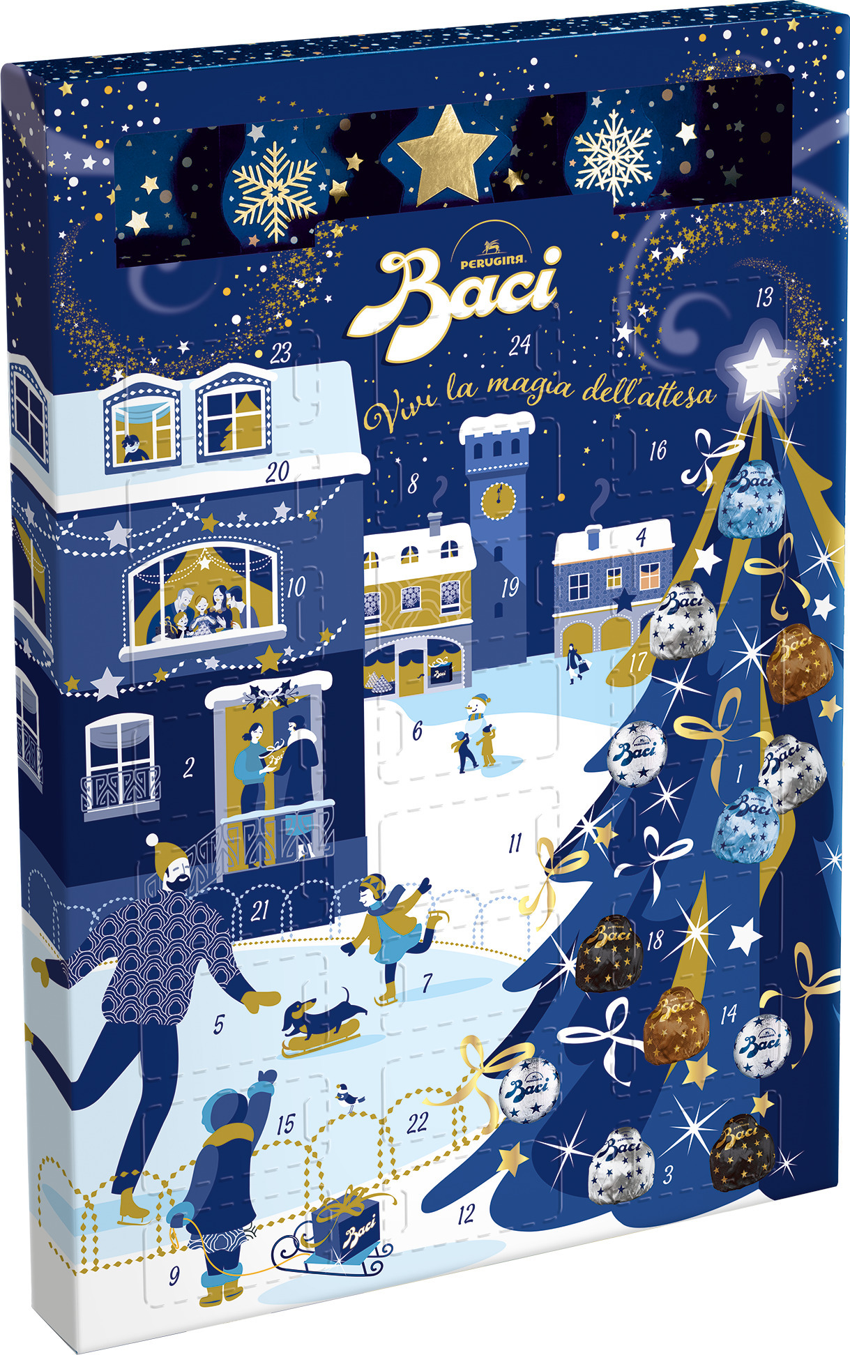 Kalendri seest leiad neli erinevat Baci sarapuupähklipralineed: klassikaline tume šokolaad, intensiivne 70% tume šokolaad, pehme piimašokolaad ja aromaatne kohv. Iga pralinee on kroonitud terve sarapuupähkliga ja kaetud sametise šokolaadiga – maitseelamus, mis ühendab pehmuse, kareduse ja Itaalia käsitöö.