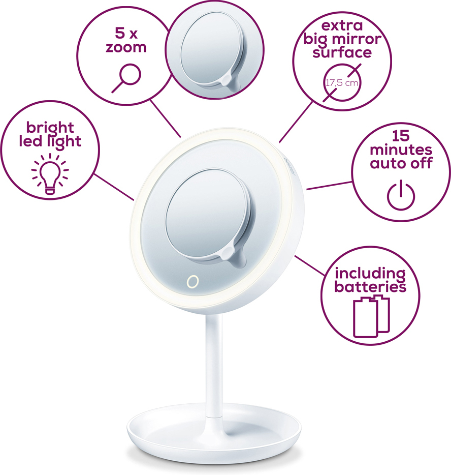 Meigipeeglil on eemaldatav magnetiline peegel, mis suurendab pilti 5 korda. Väike magnetiline peegel kinnitub kergesti suurema peegli keskele. Aluse ilus disain sobib ideaalselt kosmeetika või ehete hoidmiseks. Meigipeeglil on patareide säästmiseks ja kasutusaja pikendamiseks automaatne väljalülitus 15 minuti pärast.