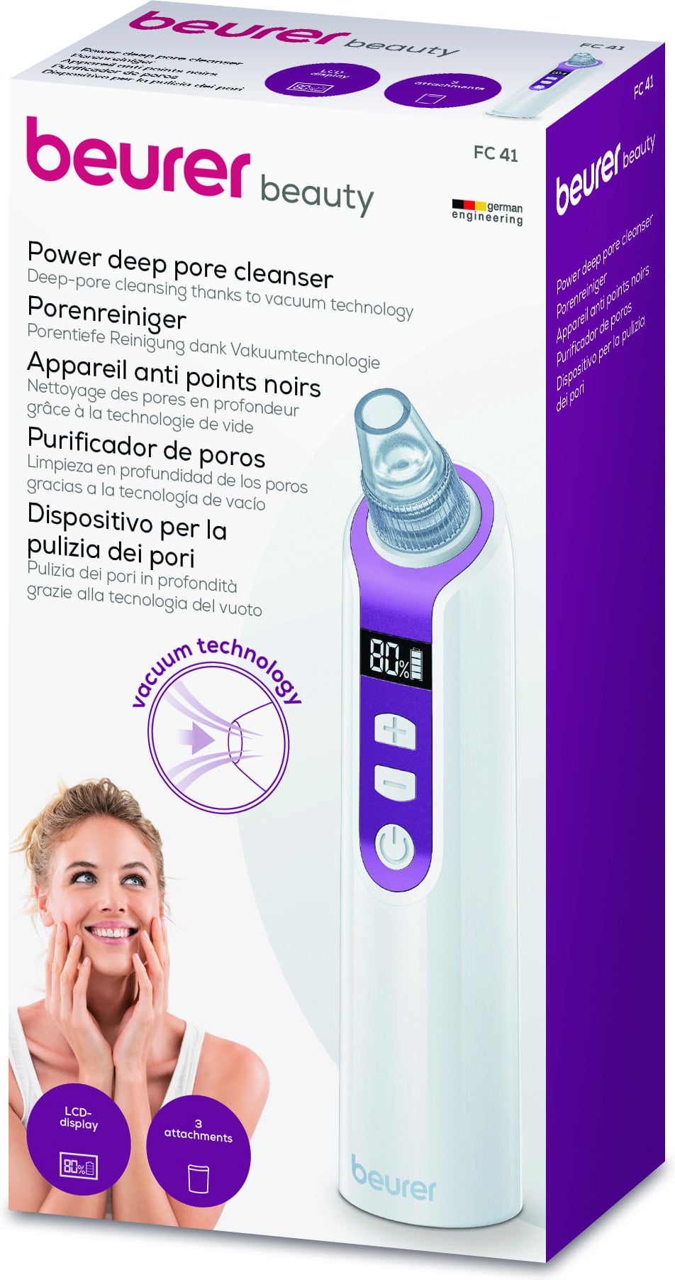 Beurer FC41 kasutab nahapooride sügavpuhastamiseks vaakumtehnoloogiat. Akutoitel seadet on lihtne kasutada ja see sobib igale nahatüübile. Sellel on kolm erinevat otsikut mitmekülgseks kasutamiseks nahahoolduses. Puhastab tõhusalt näiteks pooridest mustpead ja lisandid. Valida saab viie erineva võimsustaseme vahel.