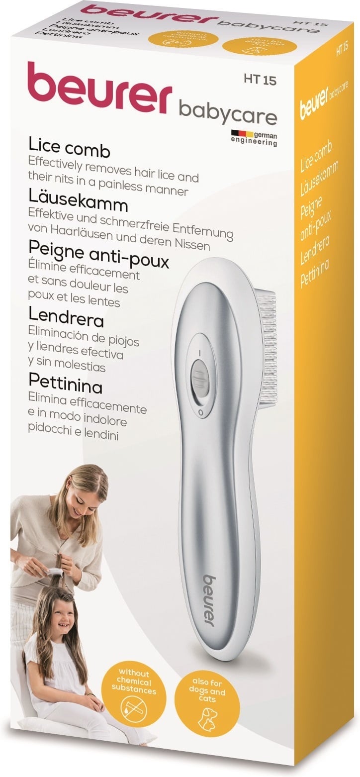 Beurer HT15 täikammiga saate juustest täidest ja täimunadest hõlpsalt lahti saada ilma täišampooni kasutamata. Kamm kannab inimestele ohutut elektripinget, mis täid ja täimunad tabades hävitab. Pakend sisaldab puhastusharja, AA-patareid ja kammiosa katet.