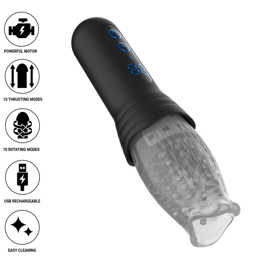 Its internal design is crafted to maximize sensation: the entry opening is mouth-shaped, while the inner tunnel is lined with small rotating nubs made from soft, flexible materials that move in sync with the motion functions to intensify pleasure.