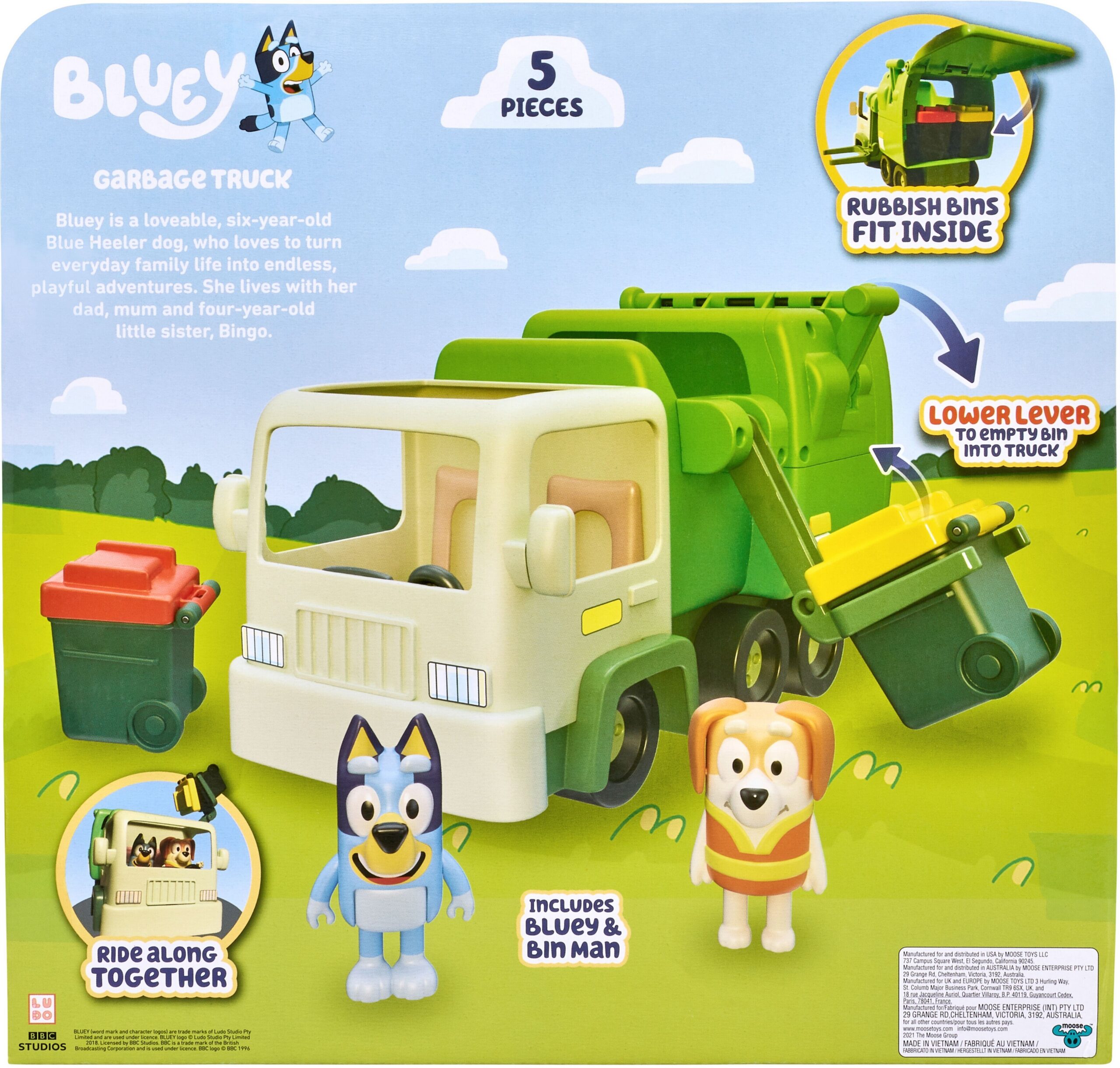 Mängukomplekt sisaldab ka prügiautojuhi figuuri, kes oskab veoautot ohutult juhtida ja näidata Blueyle, kuidas veoauto töötab ja kuidas prügi sorteerida. Seega minge prügiautojuhiga mööda naabruskonda ringi! Samal ajal saad aidata prügi koristada ja keskkonda puhtana hoida. Tühjenda prügi veoautosse kangi tõstes!