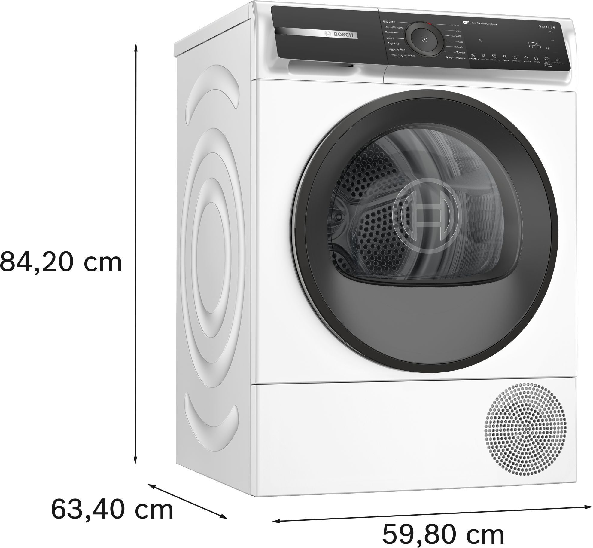 Bosch Serie 6 -lämpöpumppukuivausrumpu kuivaa jopa 9 kg pyykkiä energiatehokkaasti ja hiljaisesti. Laite sisältää AutoDry-toiminnon, useita kuivausohjelmia sekä Home Connect -etäohjauksen. Mitat: (K x L x S): 842 x 598 x 613 mm