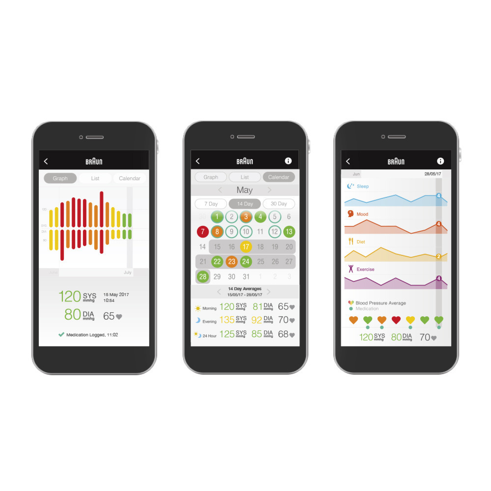 Vererõhunäite saab jälgida ka Bluetoothi ​​​​kaudu, kasutades Braun Healthy Heart rakendust. Rakendus näitab näitude trendi pikema aja jooksul ja mõõtmiskuupäevi kalendris. Tõlgendage oma tulemusi otse värvikoodiga indikaatorpaneeli abil. Saa sügavam ülevaade pikaajaliste keskmiste ja ebaregulaarse südamerütmi tuvastamise abil.