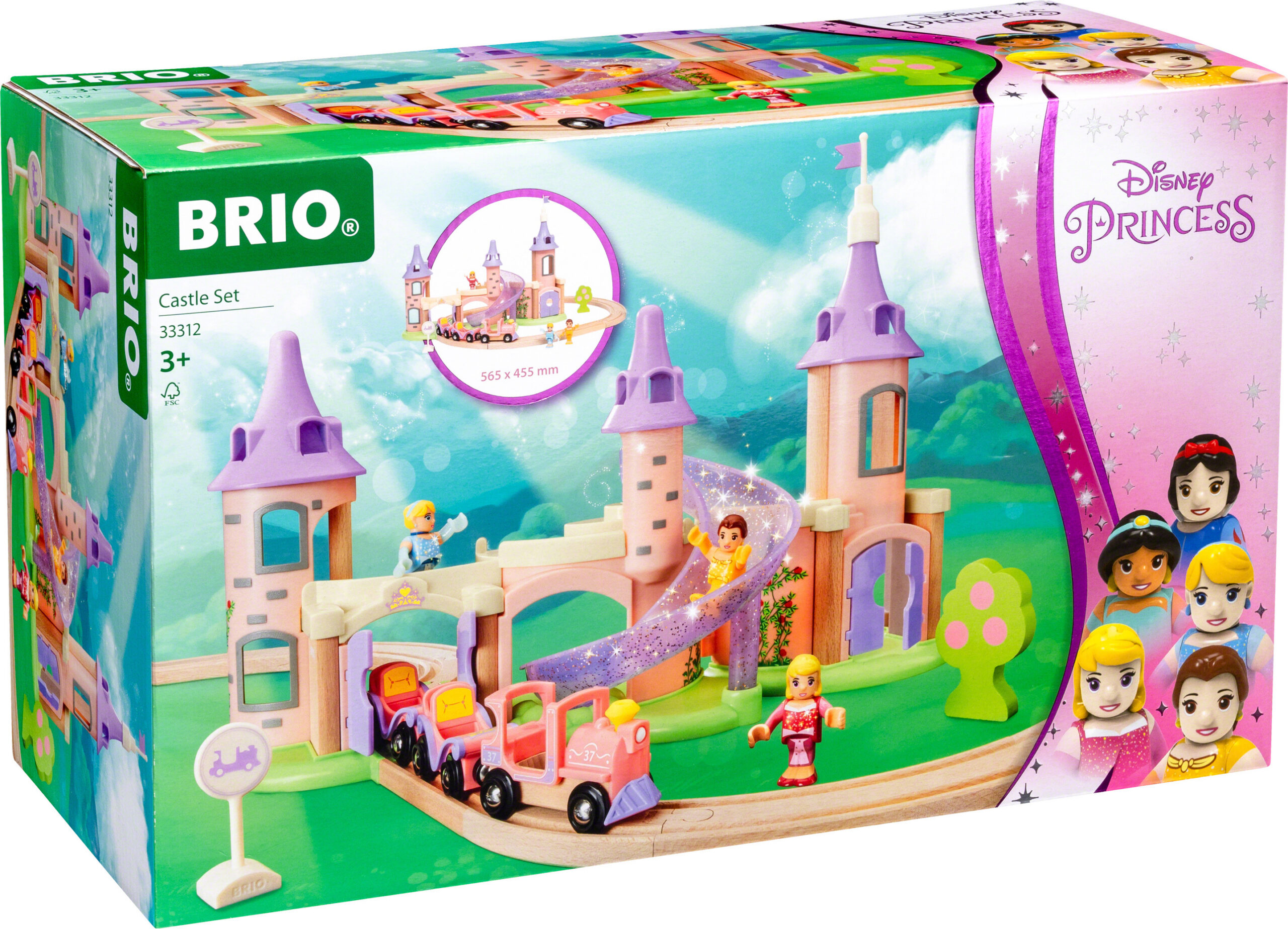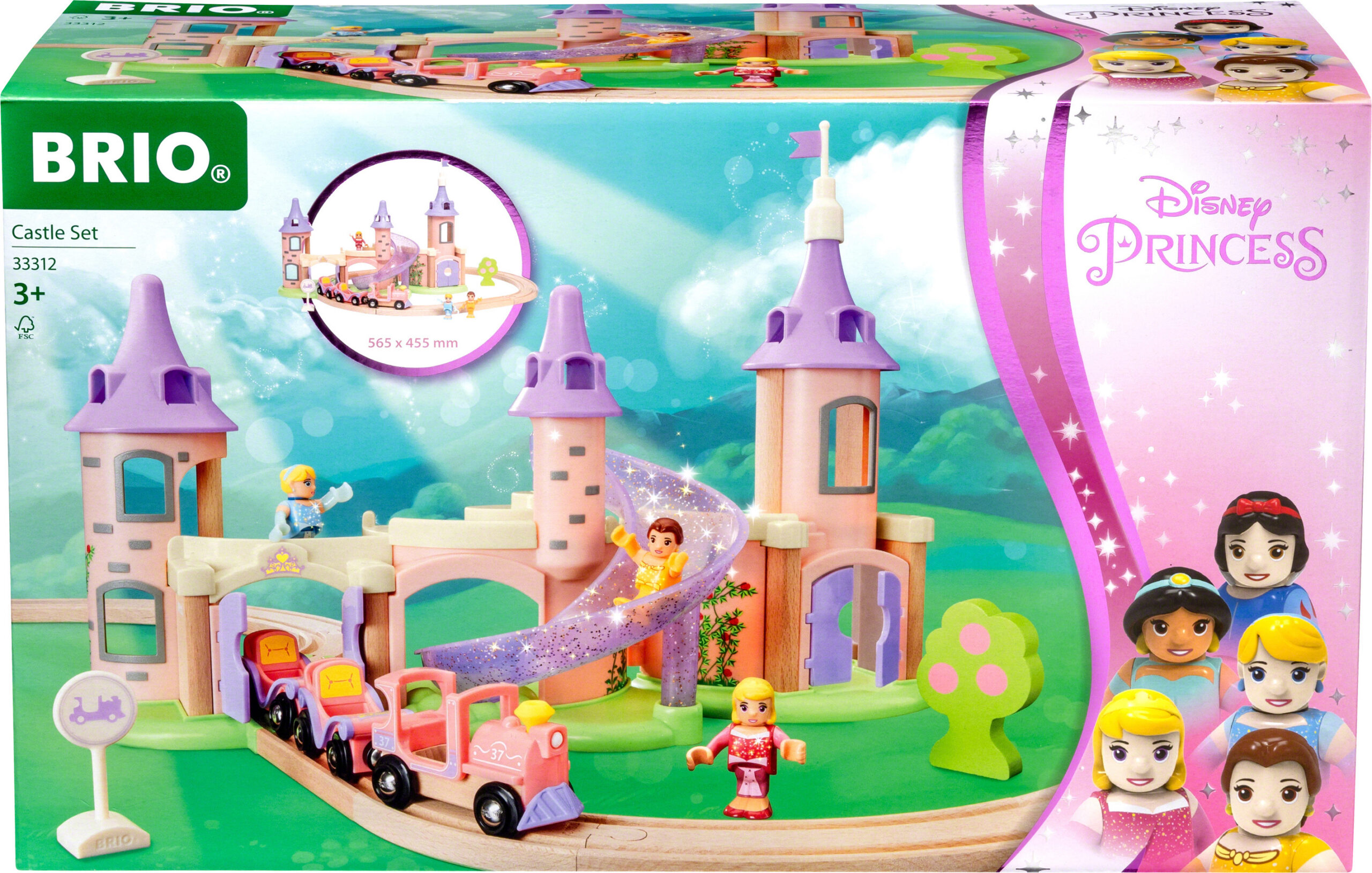 Liity satumaailmaan prinsessa Auroran, Bellen ja Tuhkimon kanssa Disney Prinsessa -linnasetti 33312 avulla. Hurmaava lelusetti sisältää upean prinsessalinnan, puiset junaraiteet, prinsessajunan ja vaunut, kolme Disney Prinsessa -hahmoa ja lisätarvikkeita. Kaikki kolme prinsessaa, Tuhkimo, Belle ja Aurora, on puettu klassisiin asuihinsa, joiden kimalle saa sädehtimään. Hyppää vaaleanpunaisen prinsessajunan kyytiin ja aja linnaan suurten porttien läpi. Avaa linna kuten nukkekoti tutustaaksesi kaikkiin tiloihin sen sisällä, kuten laulamiseen, tanssimiseen ja luovaan roolileikkiin tarkoitettuihin tiloihin. Nouse korkeimman tornin huipulle katselemaan kaunista maailmaa. Liidä sitten alas linnan maagisesti kimaltelevaa liukumäkeä pitkin ja nouse taas junaan uutta upeaa seikkailua varten.