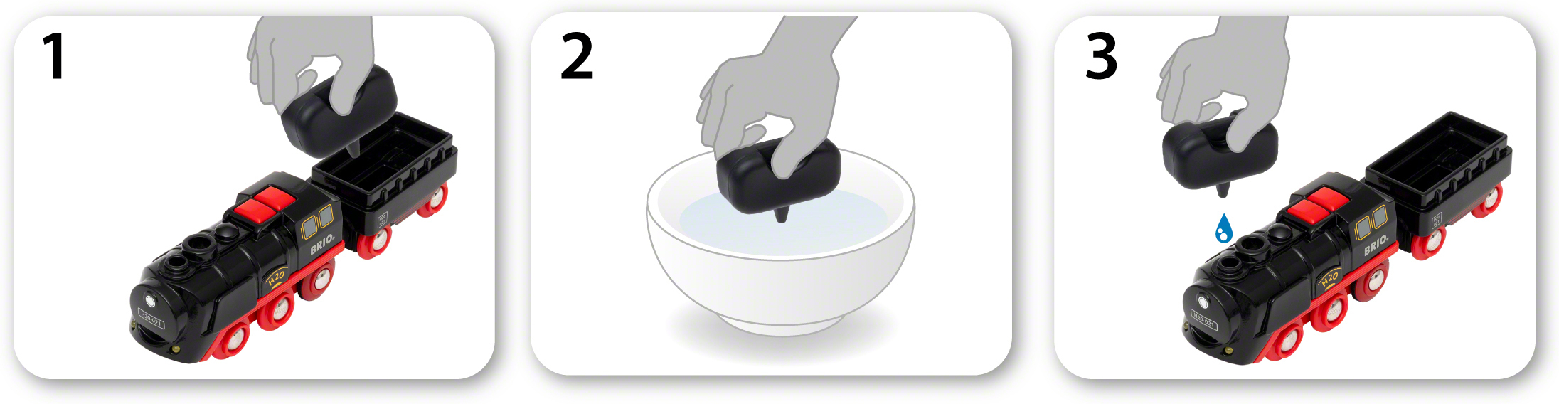 Täis auruga edasi! Patareitoitel töötav aururong 33884 tekitab BRIO Worldi raudteedel liikudes realistlikke auruefekte. Patareitoitel töötava veduri torust tulevat auru on rööbastel liikudes ohutu puudutada. Kui vesi saab otsa, saab veduri paake rongi veetava koormaga hõlpsalt täita. Kui veduril olevat punast edasiliikumisnuppu vajutada, süttib esituli ja aur hakkab uuesti tõusma. Teekond raudteedel võib jätkuda uute seikluste poole!