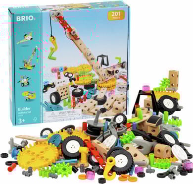 Suunnittele, rakenna ja toista BRIO Builder 34604 aktiviteettisetillä. Tämä 201-osainen setti on loistava rakennuslelu. Se sisältää kaiken tarvittavan rakentaaksesi lähes mitä tahansa. Rakenna luomuksesi käyttämällä ruuvimeisseliä, vasaraa, jakoavainta, hammasrattaita ja -pyöriä, muttereita, pultteja ja paljon muuta. Avoin rakennusleikki tarjoaa lapsille hauskan tavan kokeilla ja harjoitella käden ja silmän koordinaatiota työkalujen sekä puusta ja muovista valmistettujen osien avulla.
