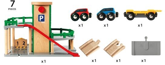 BRIO suurepärane puidust ja plastist Rail & Road parkimisgaraaž ühendab BRIO puidust raudtee ja autotee. Tõsta autod liftiga parkimisgaraaži teisele korrusele ja lase neil kaldteelt alla libiseda. Teise korruse kaldteelt liigub auto nupuvajutusega otse autoveokile – mugav! Automängule saad kiirust juurde lisada, tankides autosid parkimisgaraaži tanklas. Pakend sisaldab kokku 7 osa.