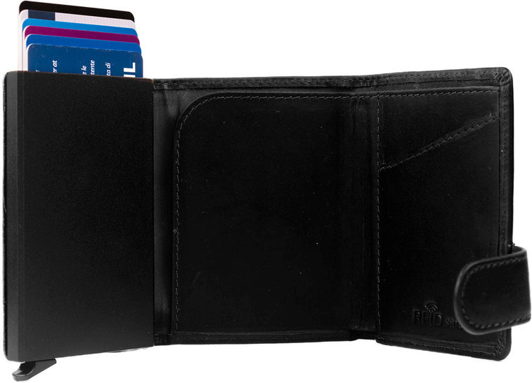 See stiilne ja turvaline kaardikott võimaldab teil hoida nii kaarte kui ka rahatähti. Korpus on valmistatud kvaliteetsest täisalumiiniumist ja väliskest kvaliteetsest ja stiilsest vahatatud nahast.