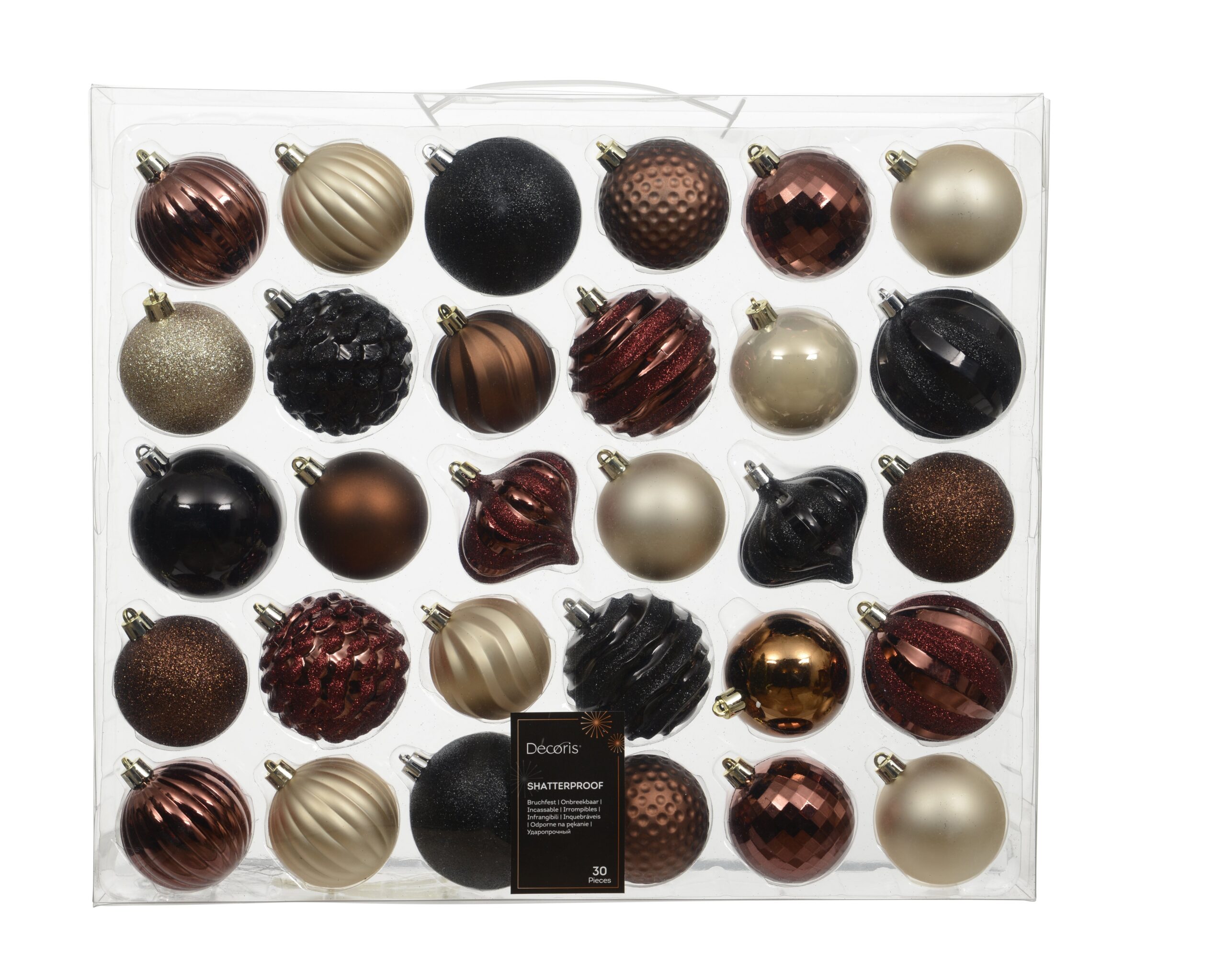 Decoris Shatterproof jõulukaunistuste komplekt sisaldab 30 erinevat cappuccino, musta ja kuldset dekoratiivpalli, mis on läikivad, matid või viimistletud sädelusega. Kaunistused on valmistatud vastupidavast purunemiskindlast plastikust ja sobivad nii rahulikeks kui ka elavateks jõulupidustusteks.