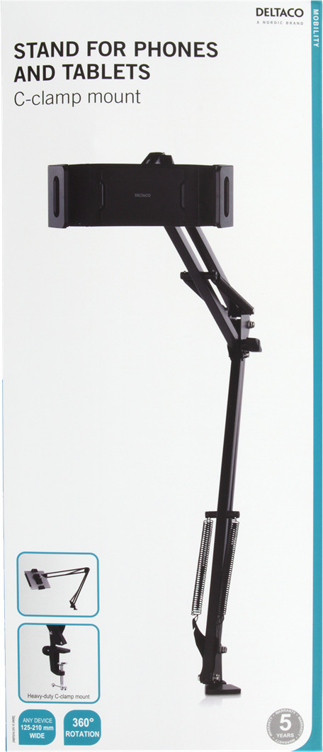 Deltaco alus sobib telefonide ja tahvelarvutitega suurusega 4–11 tolli. Alus kinnitatakse pinnale iminapa ja C-klambri abil käsitsi pingutades, nii et alust saab hõlpsalt ühest kohast teise liigutada.