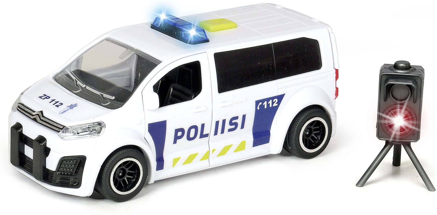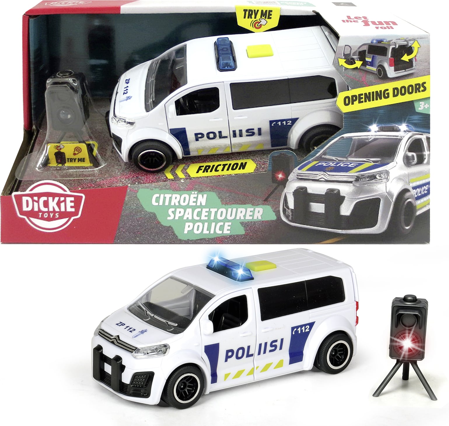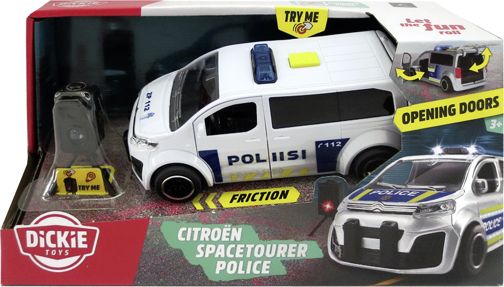 Dickie Toysin Citroën Space Tourer -poliisimaijassa on kitkamoottori, valo- ja äänitoiminnot, avattavat ovet sekä tutkalaite, jossa välähtää valo.