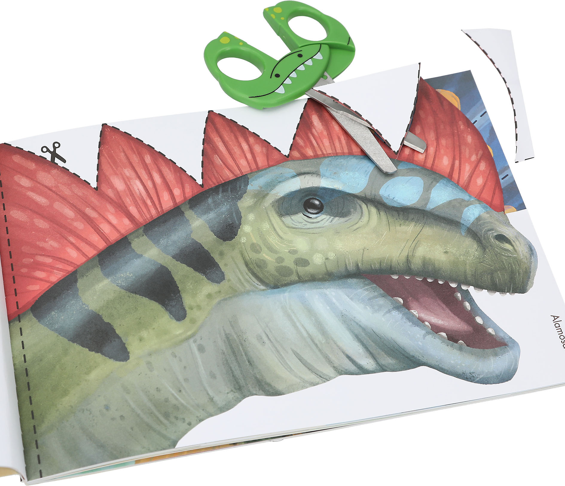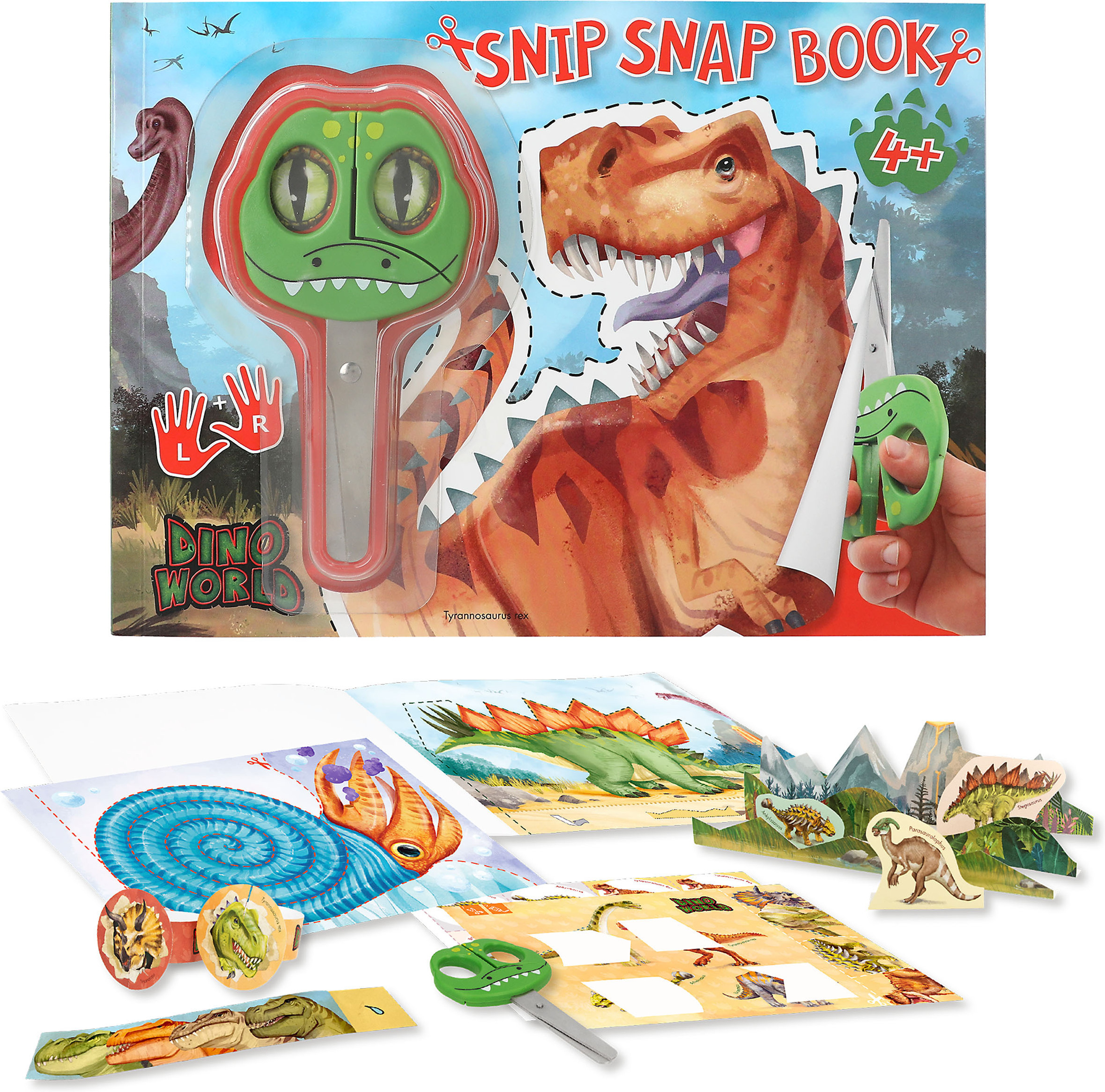 Dino Worldi loomingulisel raamatul on 25 lehekülge pilte ja ülesandeid, mida saad kääride abil lõigates hõlpsalt harjutada. Komplektis armsad dinosauruse käärid.
