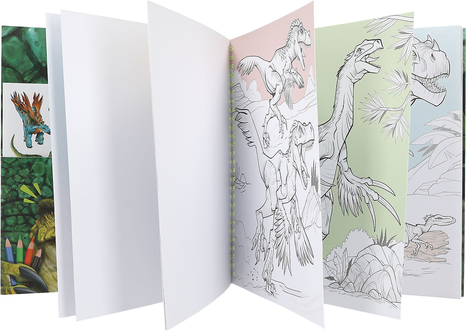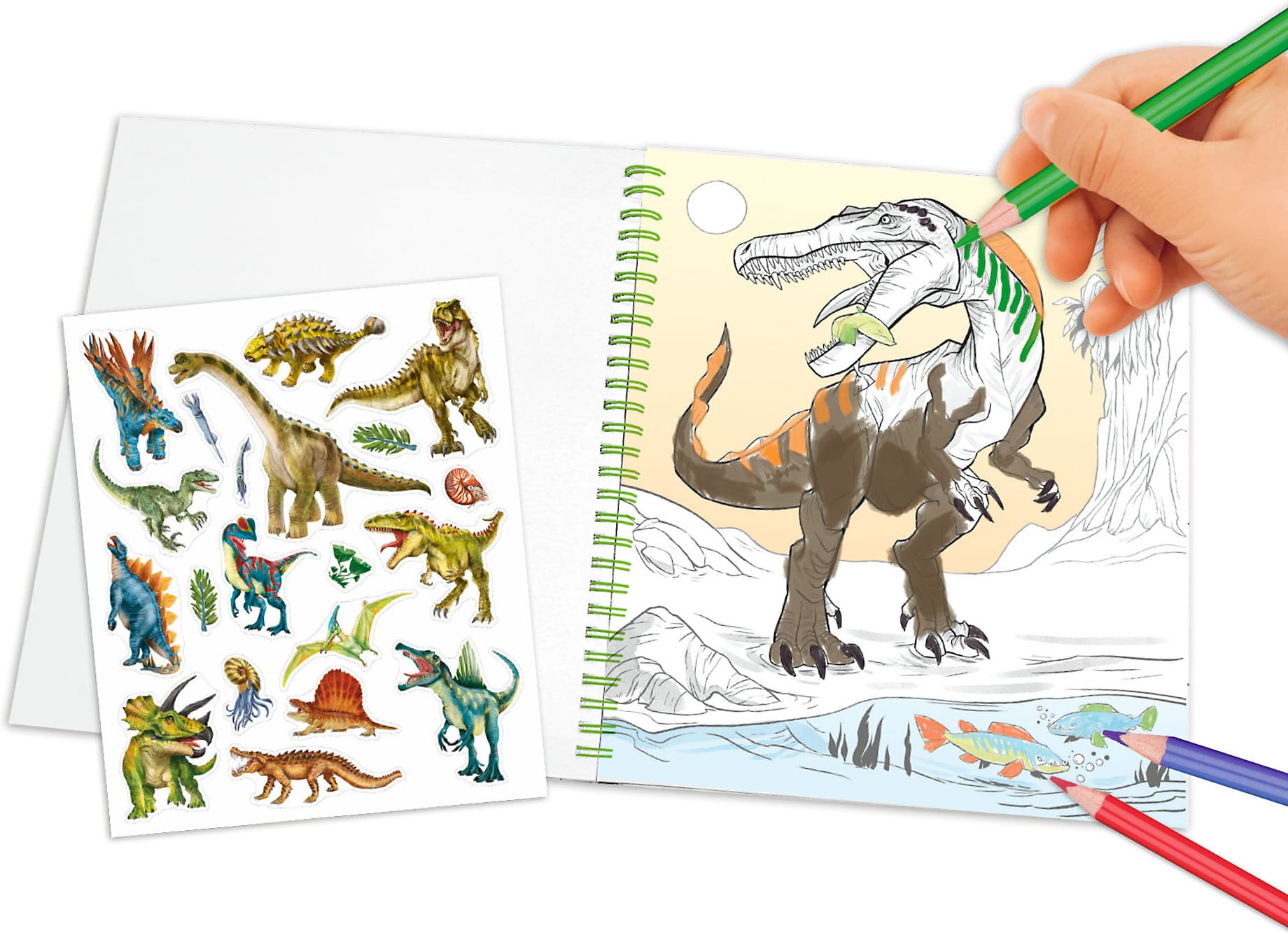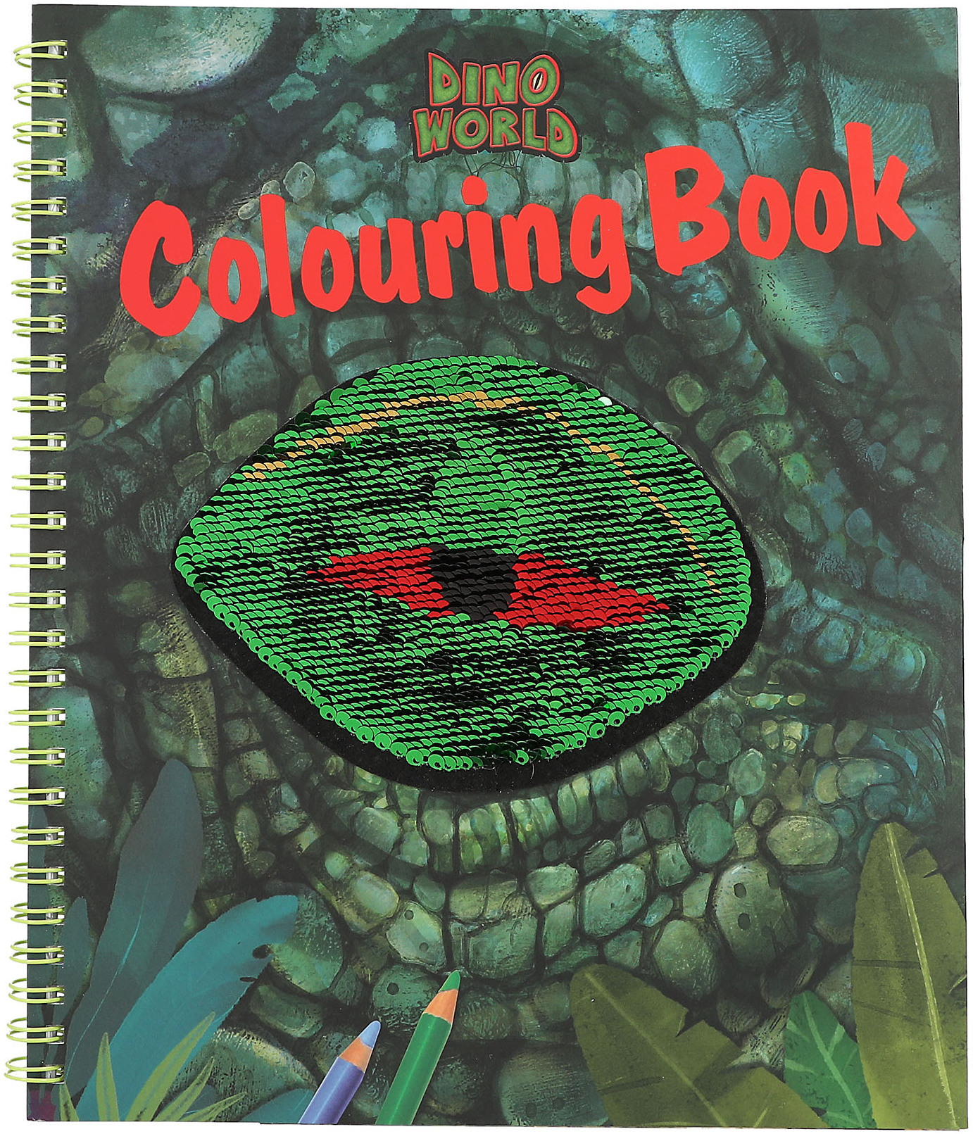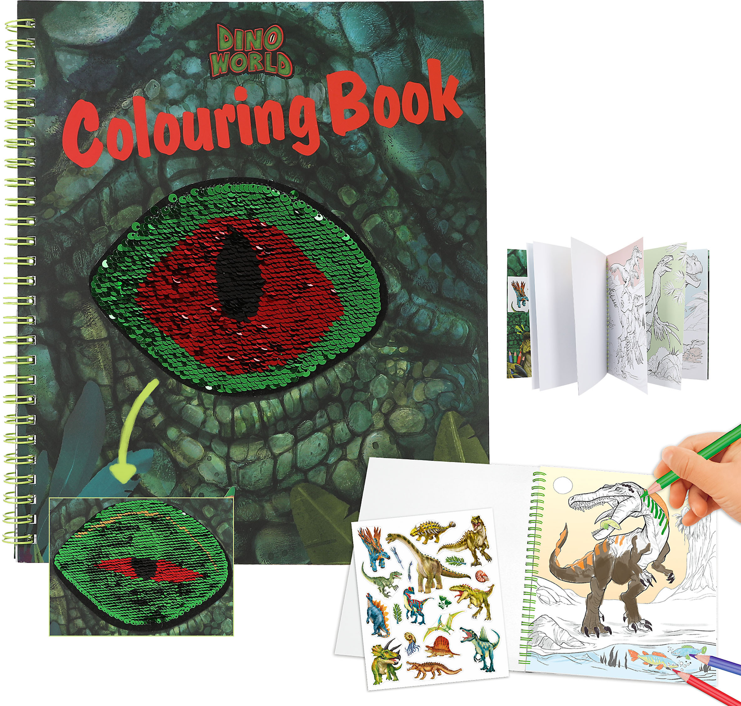 Värvi Dino Worldi värviraamatu lehekülgedelt leitud erinevad dinosaurused ja viimistle oma töö kaasasolevate kleebistega! Kaanel olev litritega silm avaneb või sulgub, kui libistad selle litreid teises suunas.