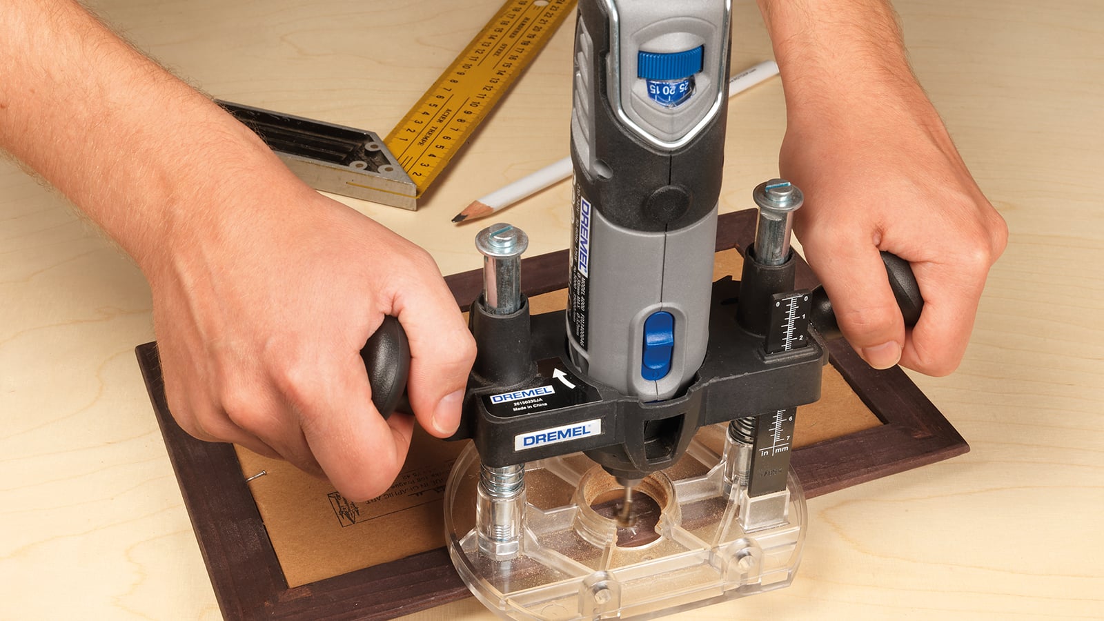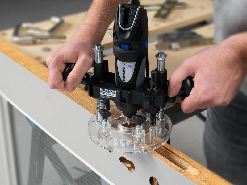 Dremeli lükkefreeskinnitusega (335) saate oma multitööriista muuta lükkefreesiks. Tänu täpsusele, stabiilsusele ja juhitavusele sobib see keskmise suurusega freesimistöödeks. Saate freesida ümaraid servi, sirgeid pilusid või freesida tooriku keskosa süvendite jaoks. Tänu läbipaistvale alusele näete toorikut kogu aeg. Freesimissügavust saab lukustada ühtlase lõike saavutamiseks. Kaasasolev serva- ja ringjuhik võimaldab teil freesida ringe ja sirgjooni.