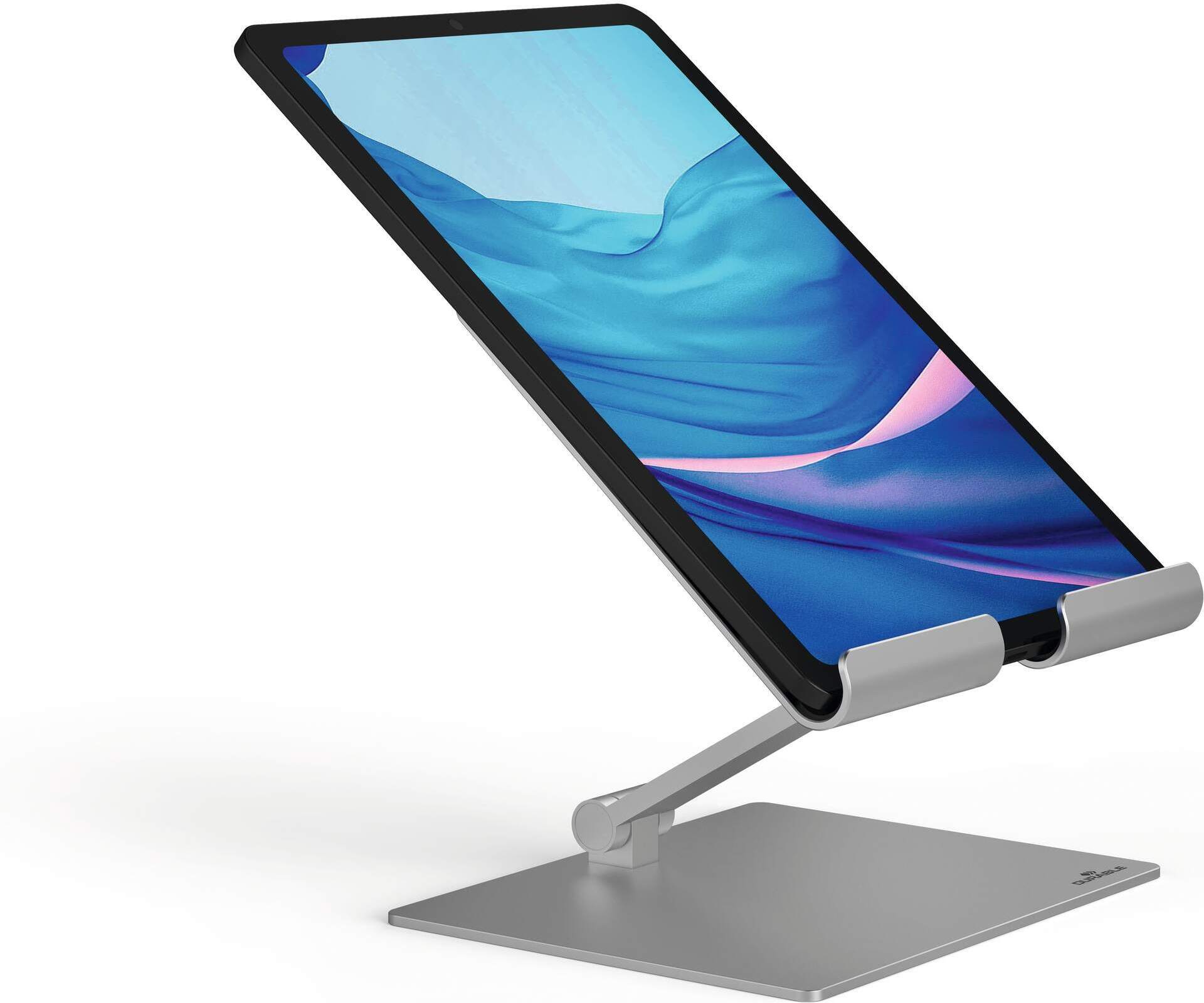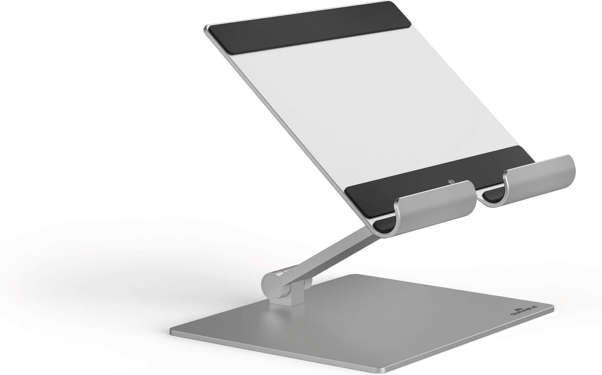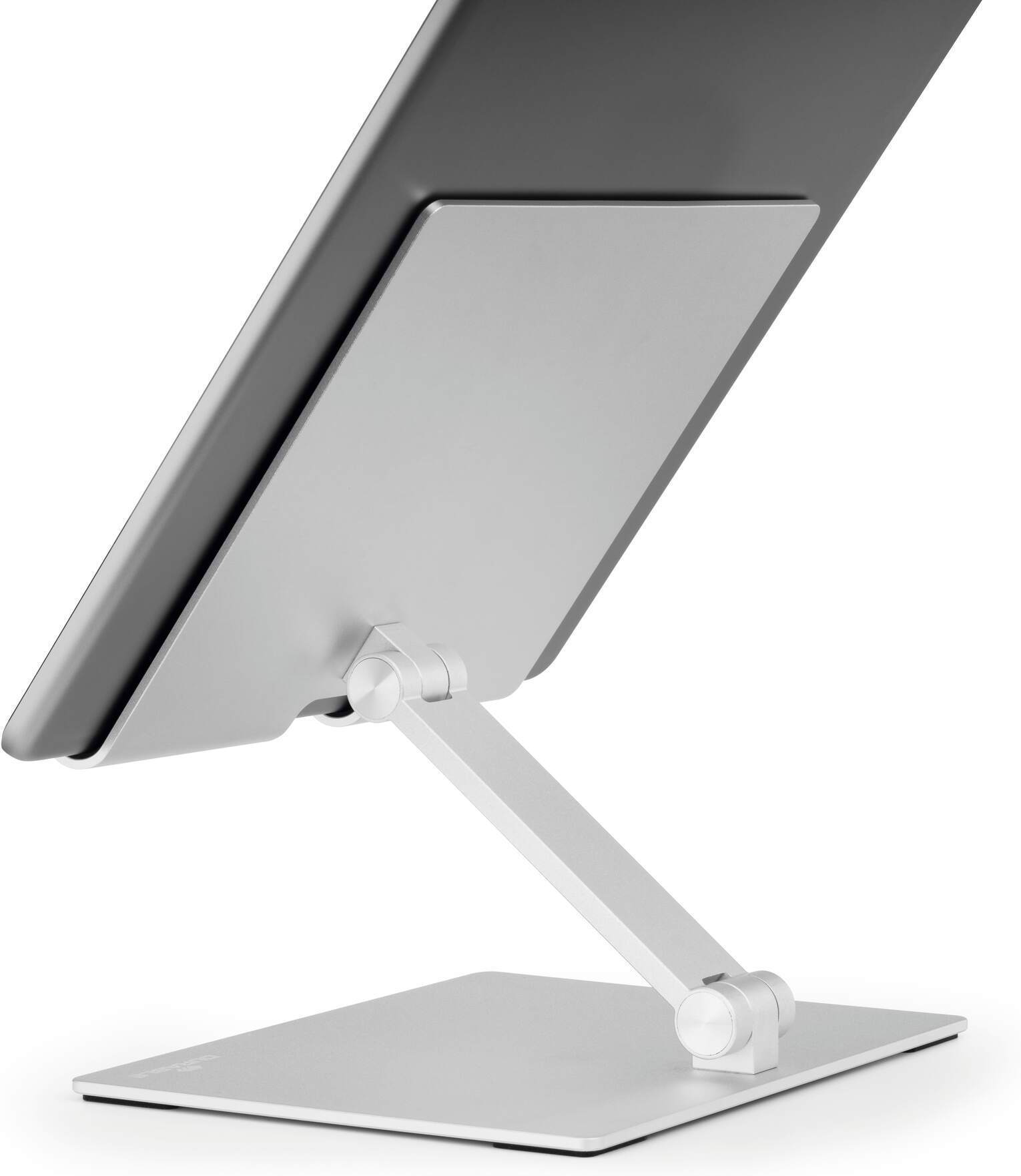 Alus võimaldab tahvelarvutit kasutada nii horisontaalselt kui ka vertikaalselt ning selle astmevaba kõrguse ja kalde reguleerimine tagab ergonoomilise vaatenurga. Kummipadjad ja serv tagavad, et tahvelarvuti püsib aluses paigal ning kui alust ei kasutata, volditakse see mugavalt kokku. Alusplaadi kummist jalad kaitsevad lauda kriimustuste eest ja hoiavad aluse kindlalt paigal.