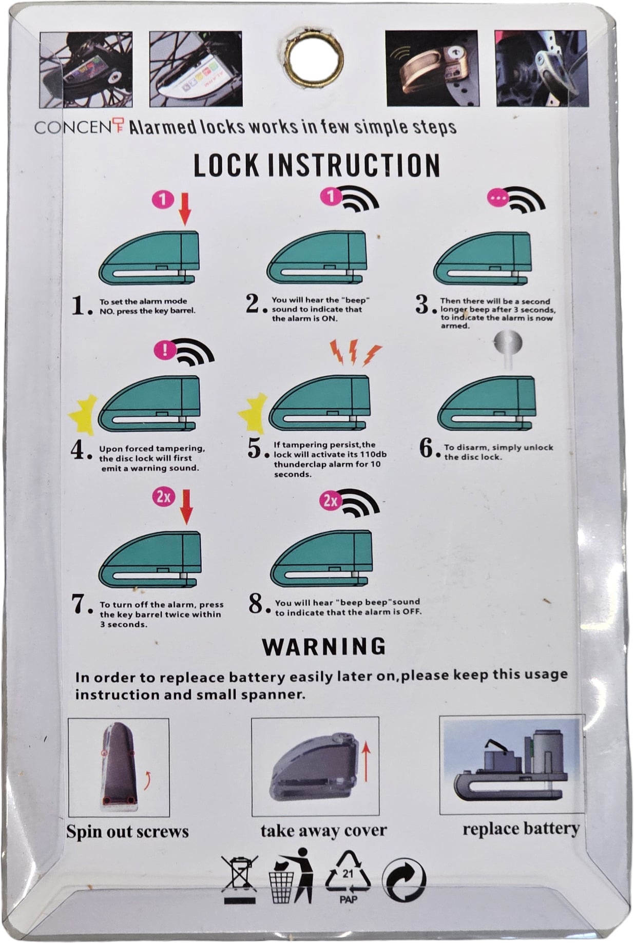 Ego elektrilise tõukeratta lukk koos alarmiga kuulub iga elektrilise tõukeratta põhivarustusse. Taskukohane ja hõlpsasti kasutatav ketaspiduri lukk kaitseb tõhusalt varguse eest. Ketaspiduri lukk on lihtne ja kiire paigaldada ja eemaldada. Elektrilise tõukeratta või elektrilise tõukeratta pidurikettale kinnitatakse ketaspiduri lukk, mis takistab sõiduki liikumist. Kui keegi proovib tõukeratast liigutada, hakkab lukk andma 110 dB helisignaali. Ketaspiduri lukul on “sügav kael” (7cm), luku saab paigutada ketaspiduri sees olevatesse suurtesse aukudesse.