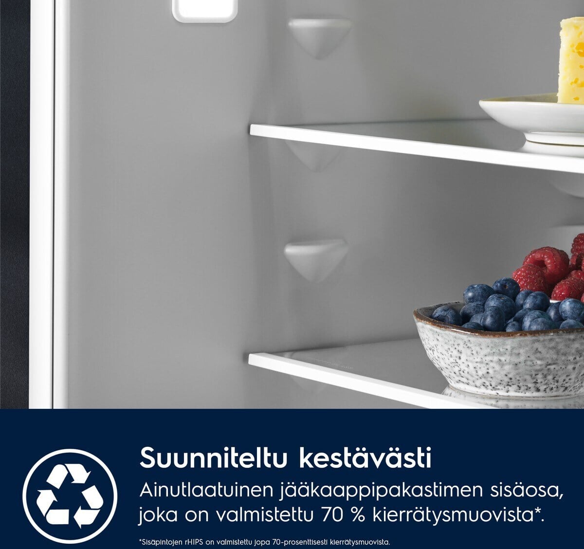 See Electrolux 600 TwinTech® No Frost külmik-sügavkülmik on loodud hoidma teie toitu kauem värske ja mahlasena. Selle uuenduslik kahekordne jahutussüsteem tagab optimaalse niiskustaseme, nii et võite kuiva toiduga hüvasti jätta. Ja mis kõige parem, sügavkülmiku sulatamine on minevik! Lisaks on see mudel samm jätkusuutlikuma tuleviku suunas, kuna selle sisemus on valmistatud taaskasutatud plastist.