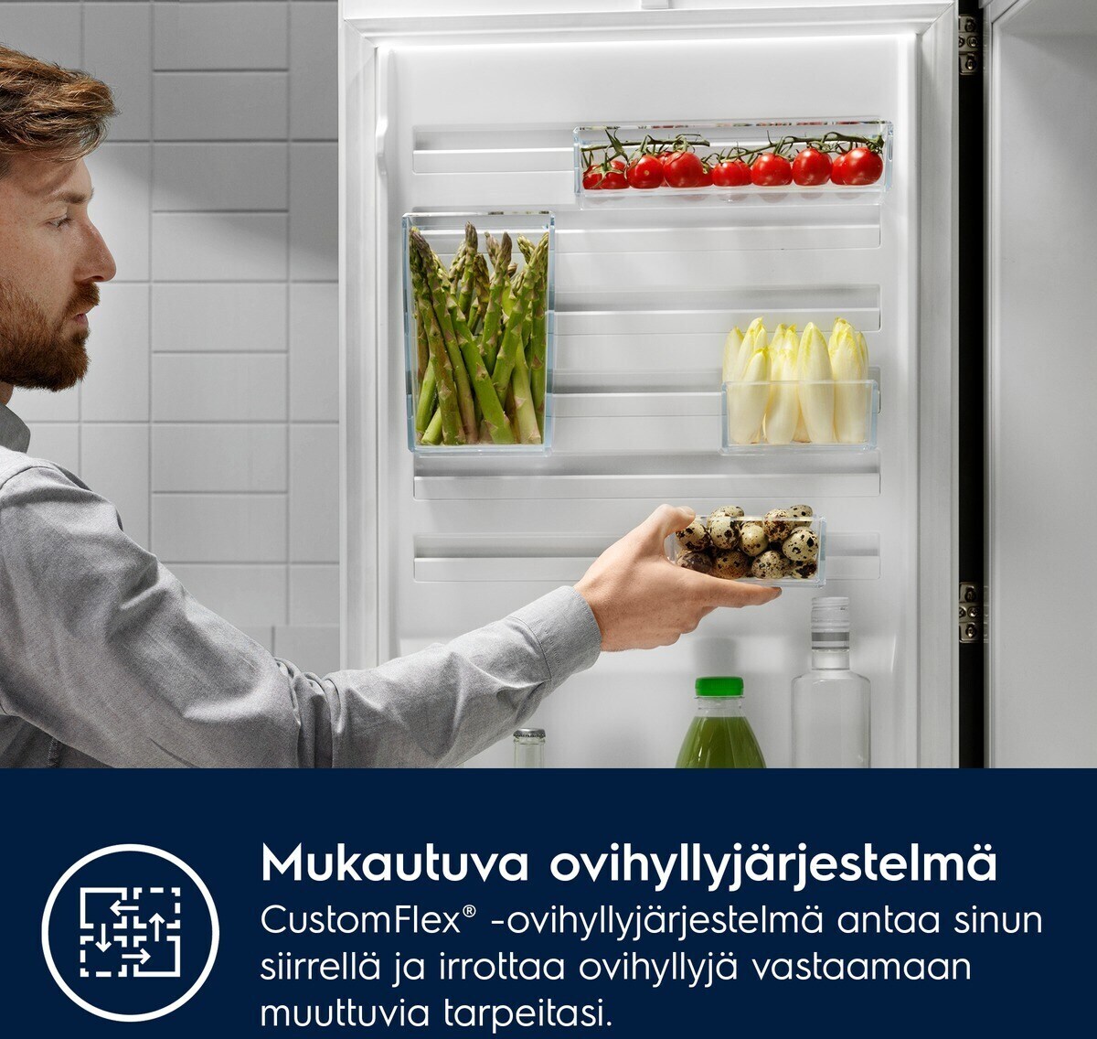 CustomFlex® annab teile vabaduse külmkapi ukse hoiuruumi korraldada. Ukse siseküljel on erineva suurusega teisaldatavad sahtlid, mida saate paigutada täpselt nii, nagu soovite. Kas vajate rohkem ruumi kõrgete pudelite või väiksemate purkide jaoks? Pole probleemi, sahtlid kohanduvad teie vajadustega ja vajadusel saab neid ka täielikult eemaldada.