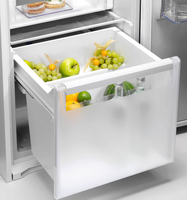 ExtraZone sahtel ja kaks köögiviljasahtlit pakuvad mugavat ruumi erinevate toiduainete hoidmiseks. Sahtlid on teleskoopsiinidel, mis muudab nende kasutamise lihtsamaks ja suurendab mugavust.