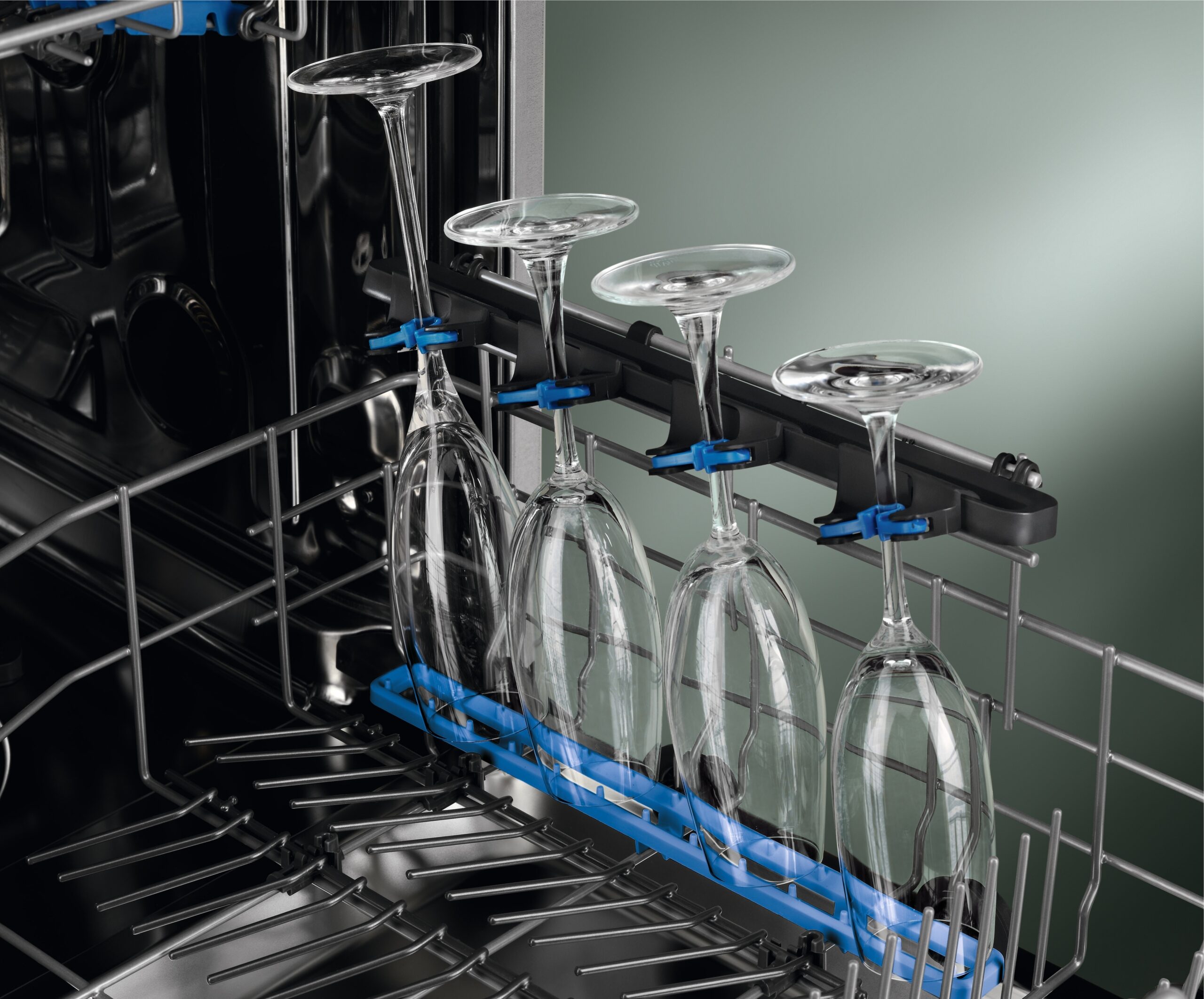 GlassCare nõudepesumasin puhastab kõik klaasid ohutult, kuni need on säravpuhtad. Ülemise korvi pehmed käepidemed ja pehmed naelad hoiavad klaase kindlalt paigal. Alumise korvi klaasiriiul tagab pikkade vartega klaaside õrna pesemise.