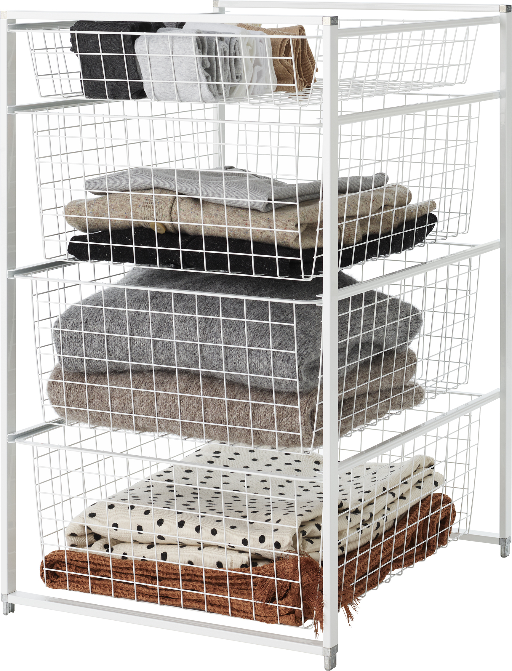 Elfa traditsiooniline korviriiulite komplekt sobib ideaalselt riidekappidesse, abiruumidesse, panipaikadesse või muudesse kohtadesse, kus on vaja põrandal hoiustamist. Tekstiilid püsivad traatkorvides puhtad ja õhulised.