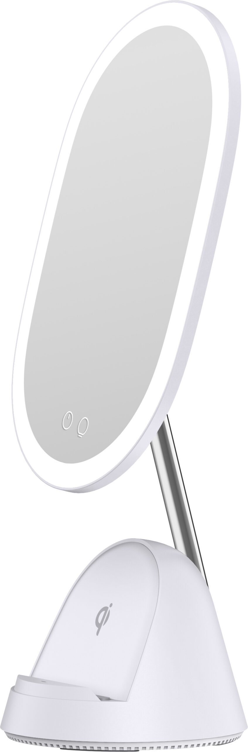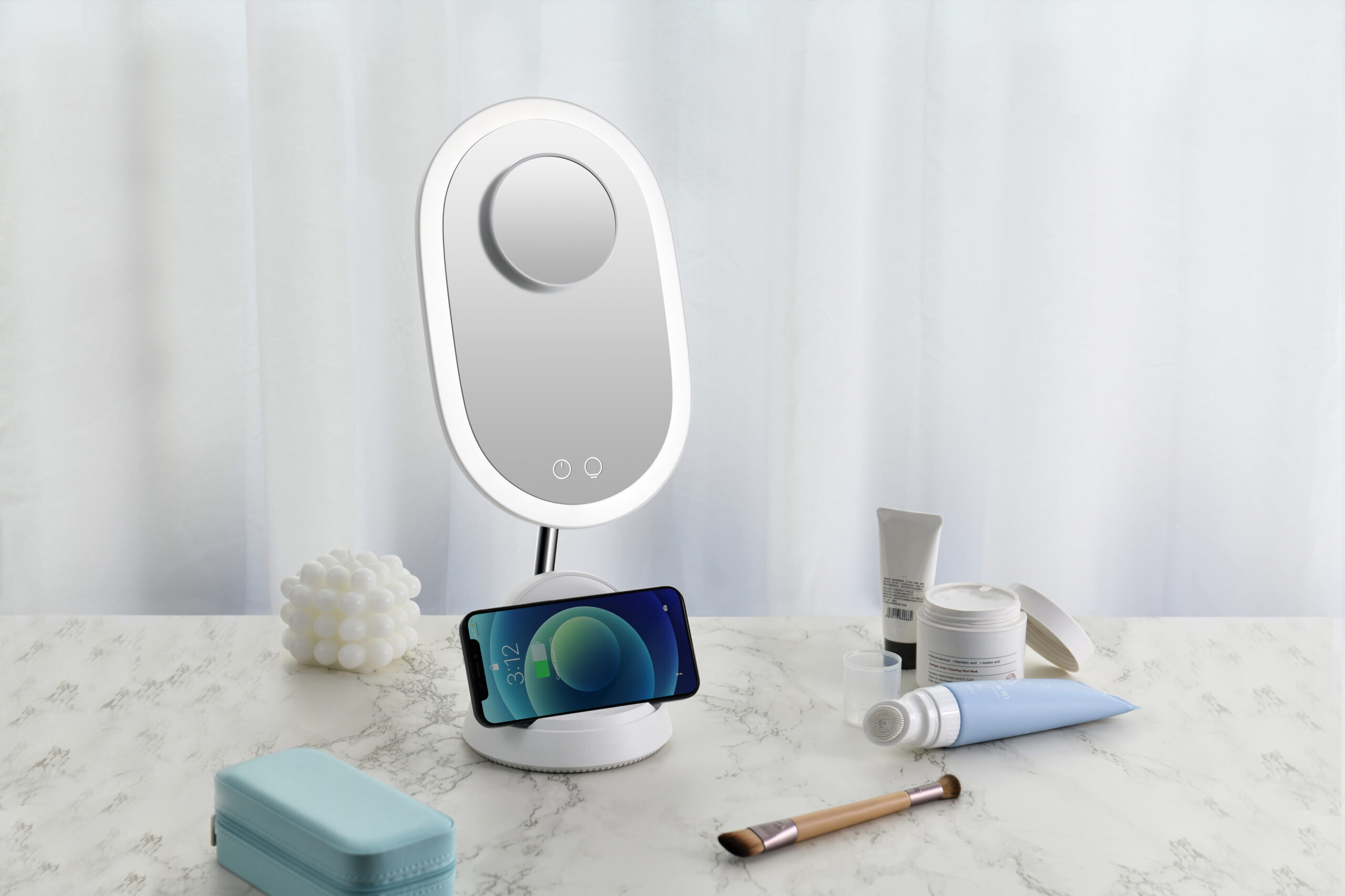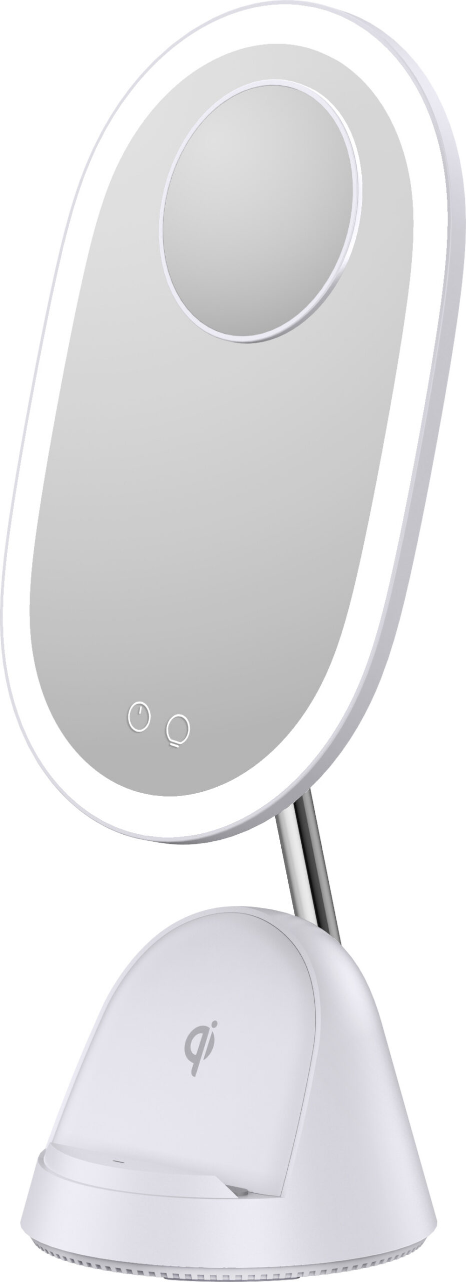 Juhtmevaba laadimisalus: Meigipeegel sisaldab integreeritud 10 W juhtmevaba laadimisalust, mis võimaldab telefoni mugavalt laadida samal ajal, kui seda pähe paned. Telefon püsib laadimisalusel ka ideaalse nurga all, näiteks videote või kosmeetikaõpetuste vaatamiseks meigi pealekandmise ajal. Hoia oma telefon laetuna ja hõlpsasti ligipääsetavana.