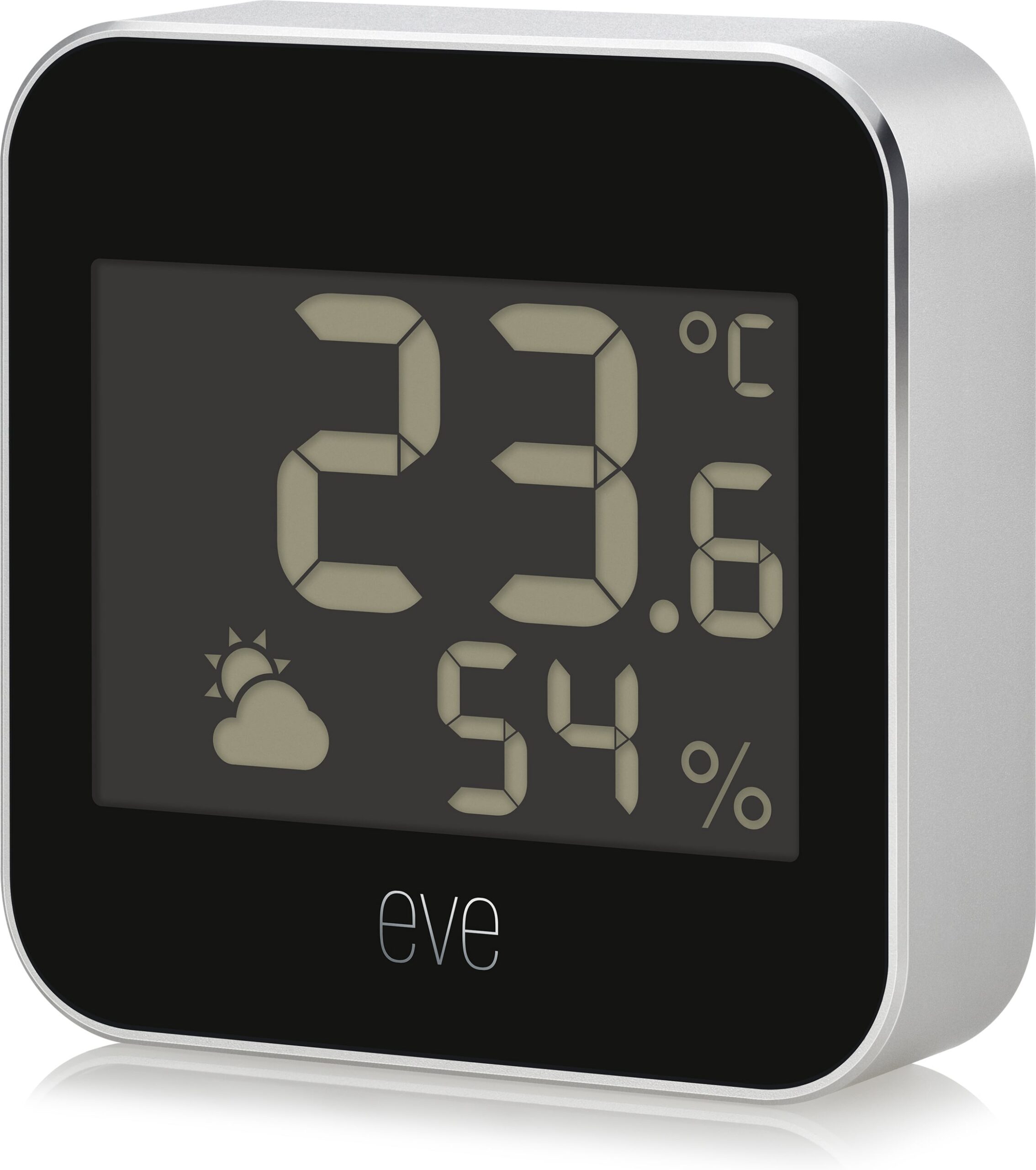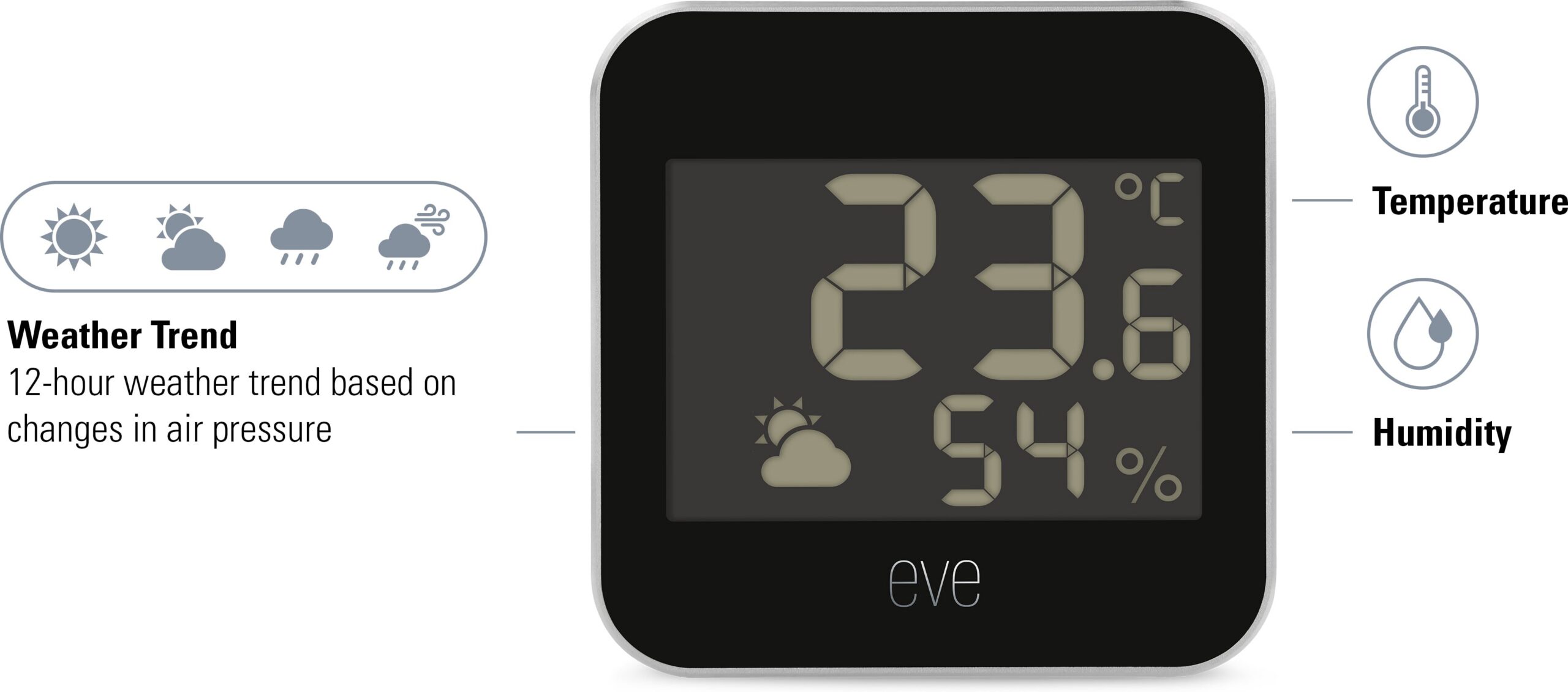 Eve Weather – nutikas multifunktsionaalne andur sise- ja välistingimustes kasutamiseks. Eve Weather on stiilne ja kompaktne multifunktsionaalne andur, mis on valmistatud anodeeritud alumiiniumist, mis mõõdab temperatuuri, niiskust ja rõhku. Seadme selge LCD-ekraan kuvab mõõtmisandmeid ja ilmastikunähtusi lühidalt.