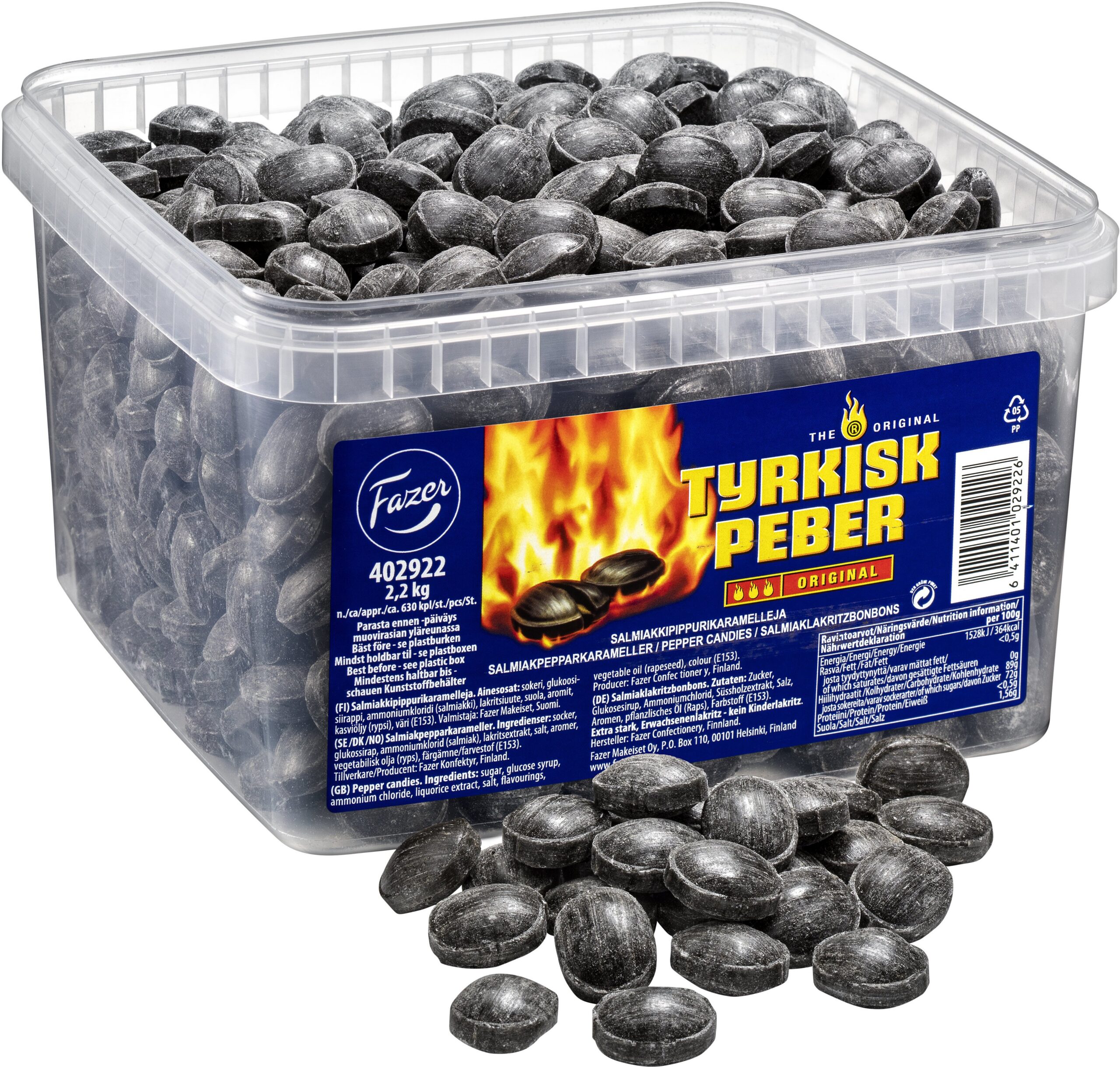 Vürtsikas Türgi pipar on olnud salmiaki-sõprade lemmik alates 1977. aastast. Fazer Tyrkisk Peber Original lahtiste kommide salmiaki-koor ümbritseb pipraset salmiaki-täidist. Fazer Tyrkisk Peber Original sobib eriti hästi kõige seiklushimulisematele salmiaki-sõpradele! Karbis on u. 630 maiustust.