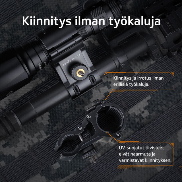 Fenix ALG-18 relvakinnitus on mõeldud tule kinnitamiseks relva toru külge. Paigaldamiseks pole tööriistu vaja, seega on seda lihtne paigaldada. Fenix ALG-18 sobib 18–23 mm läbimõõduga relvaraudadele. Tugev kinnitusmehhanism ja kummist tihendid kaitsevad kriimustuste eest ja hoiavad lampi kindlalt paigal.