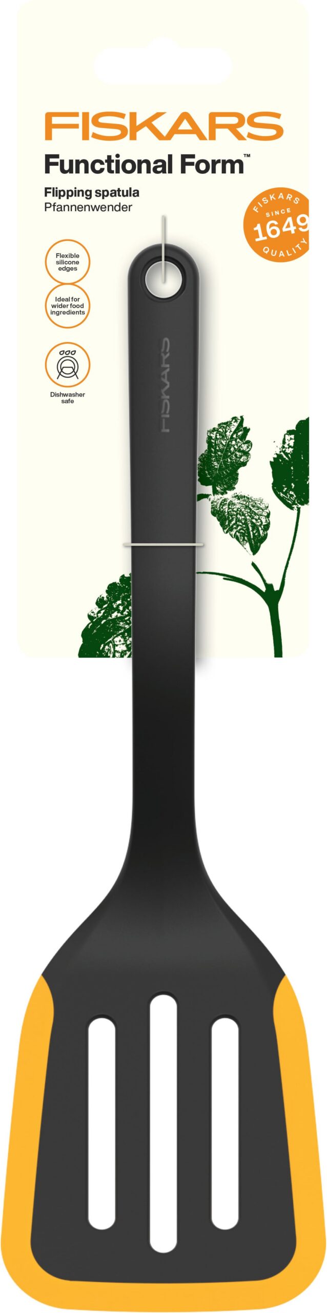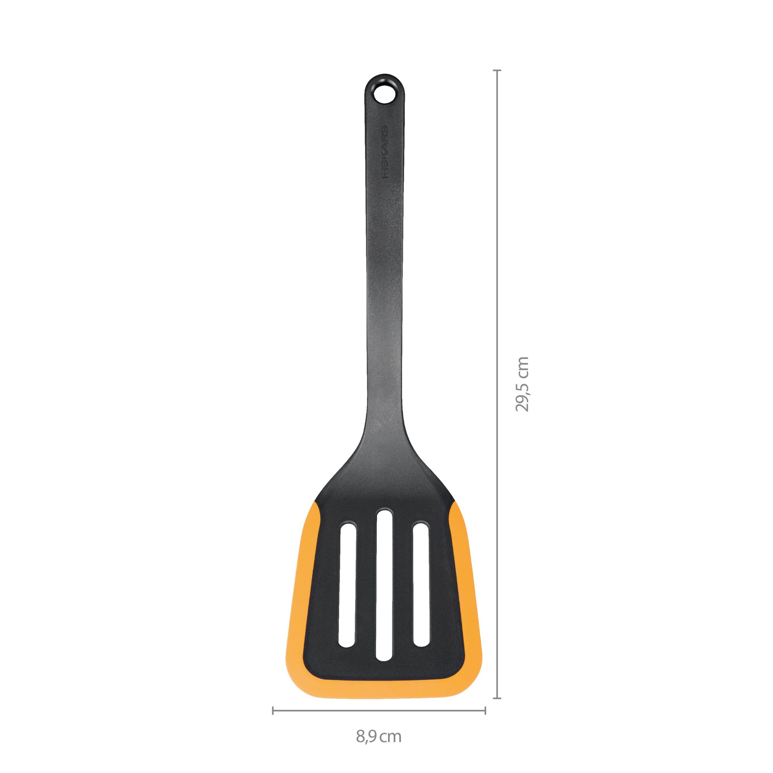 Fiskars Functional Form -lasta on nerokkaasti muotoiltu joka keittiön perusväline. Leveä ja taipuisa pää sopii erinomaisesti omelettien, lettujen ja muiden hellävaraista käsittelyä vaativien ruokien kääntelyyn. Muotoilu tukee sujuvaa työskentelyä ja auttaa säilyttämään ruoan rakenteen ehjänä.