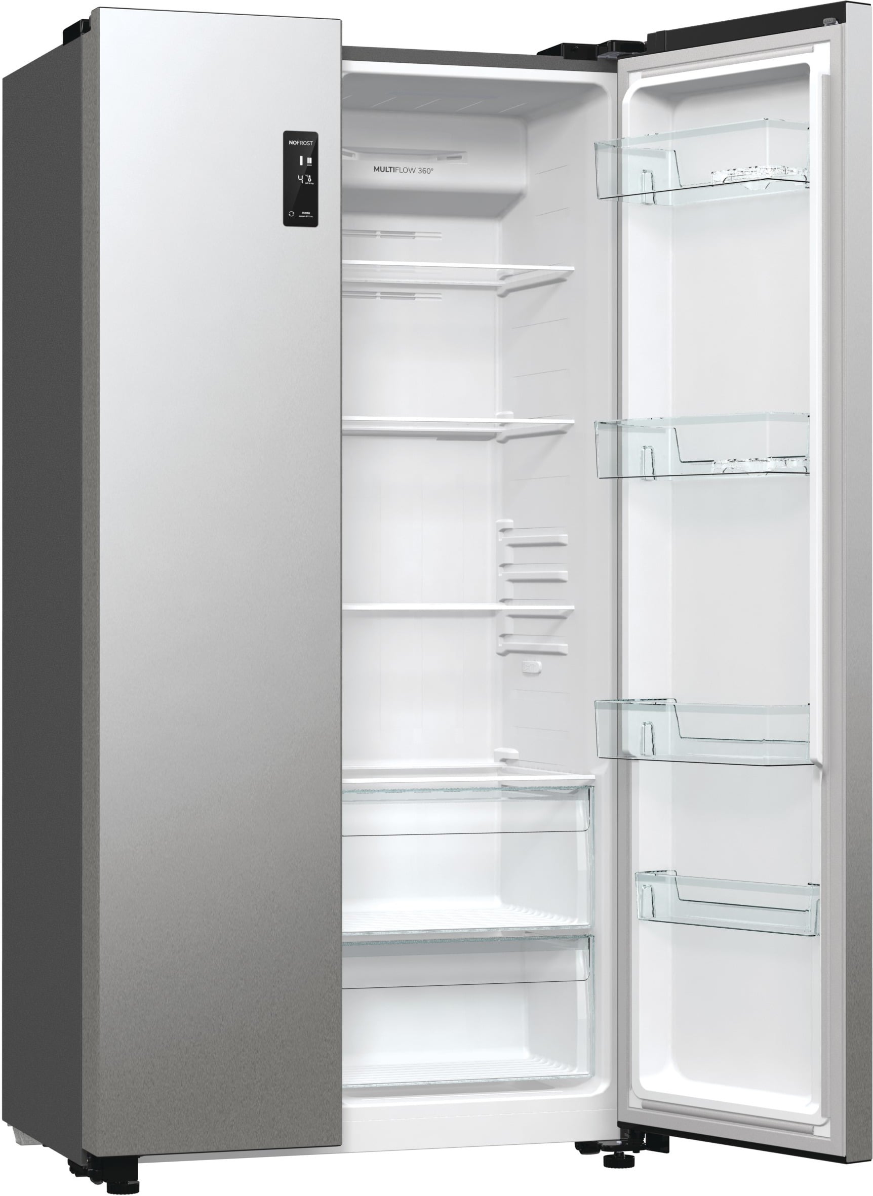 Gorenjen side-by-sidessä on paljon käyttöä helpottavia ominaisuuksia: kaapin ovissa on selkeä ohjausta helpottava LED-näyttö ja sekä merkkivalo että hälytysääni, joka huomauttaa auki jääneestä ovesta tai liian korkeasta lämpötilasta. Jääkaapin MultiFlow-toiminto kierrättää ilmaa tasaisesti jääkaapin sisällä ja auttaa siinä, että elintarvikkeesi säilyvät tuoreena pitkään. Multiflow järjestelmän ansiosta voit sijoittaa minkä vain elintarvikkeen mille tahansa hyllylle, koska lämpötila on sama kaikilla hyllyillä. Jääkaapin hyllyt ovat turvalasia, ne on helppo pitää puhtaana ja näet helposti mitä hyllyillä on. Hyllyjä voit myös säätää sen mukaan, minkä kokoisia elintarvikkeita jääkaapissa on. Ovihyllyissä säilytät purkkeja, purnukoita, tuubeja ja kaikenlaista pikkutavaraa. Isot, ulosvedettävät vihanneslaatikot auttavat pitämään juurekset, hedelmät ja vihannekset tuoreena mahdollisimman pitkään. Tehokas LED-valo valaisee kaapin joka kolkan. LED-valo on myös kestävä ja kuluttaa vähemmän energiaa perinteisiin lamppuihin verrattuna. Voit asettaa opastavasta LED-näytöstä jääkaapin ja pakastimen lämpötilan haluamaasi asteen tarkkuudella. Jääkaapin voit säätää välille +1⁰ – +9⁰ ja pakastimen välille -16⁰ – -24⁰. Voit siis helposti muuttaa lämpötilaa säilytettävien elintarvikkeiden mukaan.