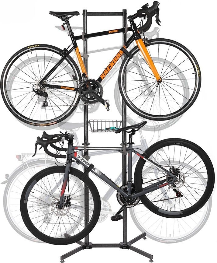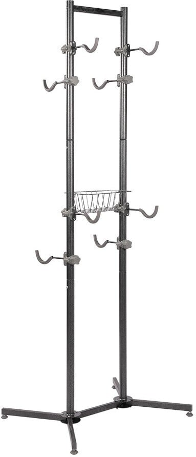 Hoidiku V-kujulised jalad muudavad selle stabiilseks ja jalgu saab vajadusel ebatasasele pinnale sobitamiseks reguleerida. Rattahoidiku hoobasid saab individuaalselt üles või alla reguleerida, et rattad soovitud kõrgusele seada. Polüamiidist valmistatud klambrid on kulumiskindlad ja neid on lihtne pingutamise teel reguleerida. Hoidiku käepidemete TPR-plastist kate kaitseb teie jalgratast löökide eest. Riiuli keskel olev korv mahutab tööriistu või jalgrattatarvikuid.