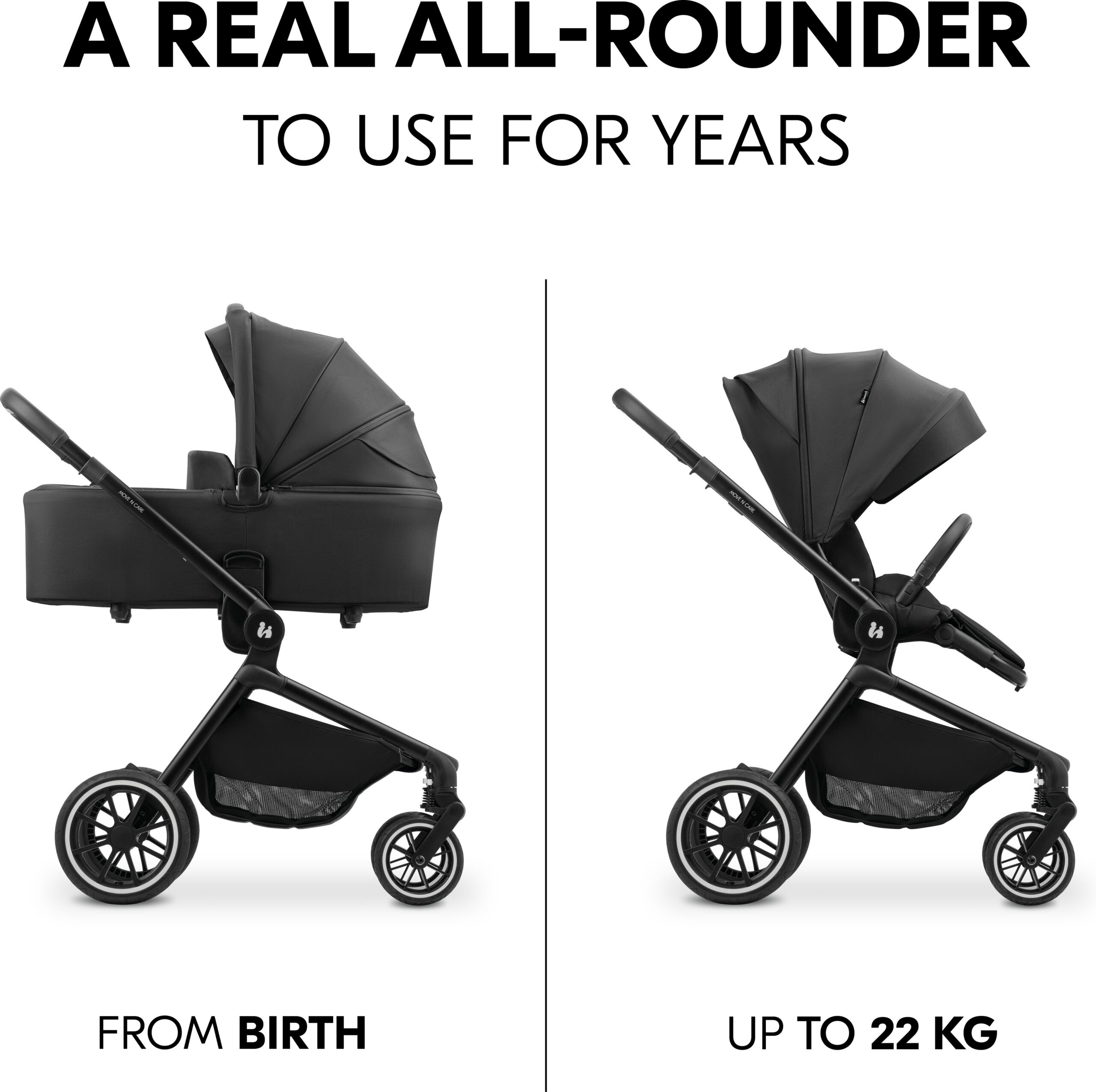 Hauck Move N Care Set lapsevankrid kohanduvad lapse kasvades. Lapsevankri vastupidav alumiiniumraam koos reguleeritava teleskoopkäepidemega muudab sellega linnatänavatel manööverdamise lihtsaks. Lisaks tagavad torkekindlad maastikurehvid ja neljasuunaline vedrustus mugava sõidu ka ebatasasel teekattel. Pikendatav XL-päikesesirm (UPF 50+) kaitseb last päikese eest ning võrgust aken võimaldab piisavat õhuringlust kogu reisi vältel. 5-punkti turvarihmad hoiavad teie lapse kindlalt paigal, samas kui reguleeritavat jalatuge/seljatuge saab kolme erineva nurga alla voltida.