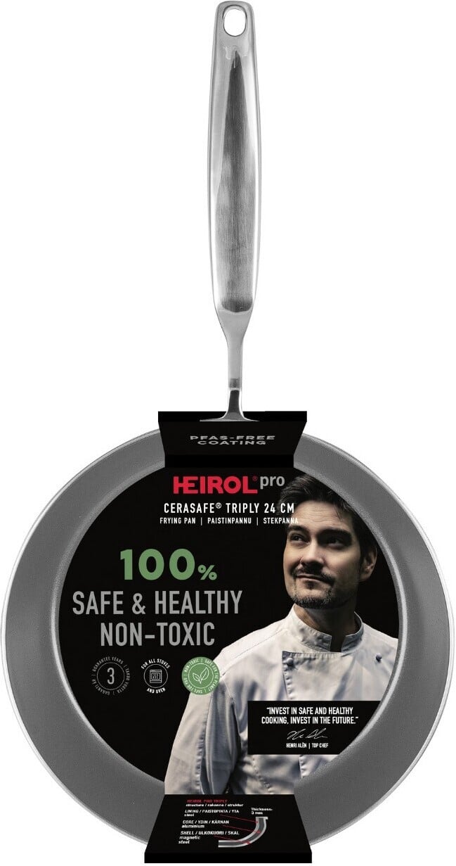 Uuendatud Cerasafe® Triply praepann on 100% PFAS-vaba ja plastikuvaba ning garanteerib tervisliku toiduvalmistamise. HEIROL Cerasafe® Triply toodetel on keraamiline kate, mis on alates toote tootmisprotsessidest täiesti vaba inimestele ja loodusele kahjulikest PFAS-kemikaalidest. Toode kestab kaua ja on seetõttu ka professionaalide lemmik.