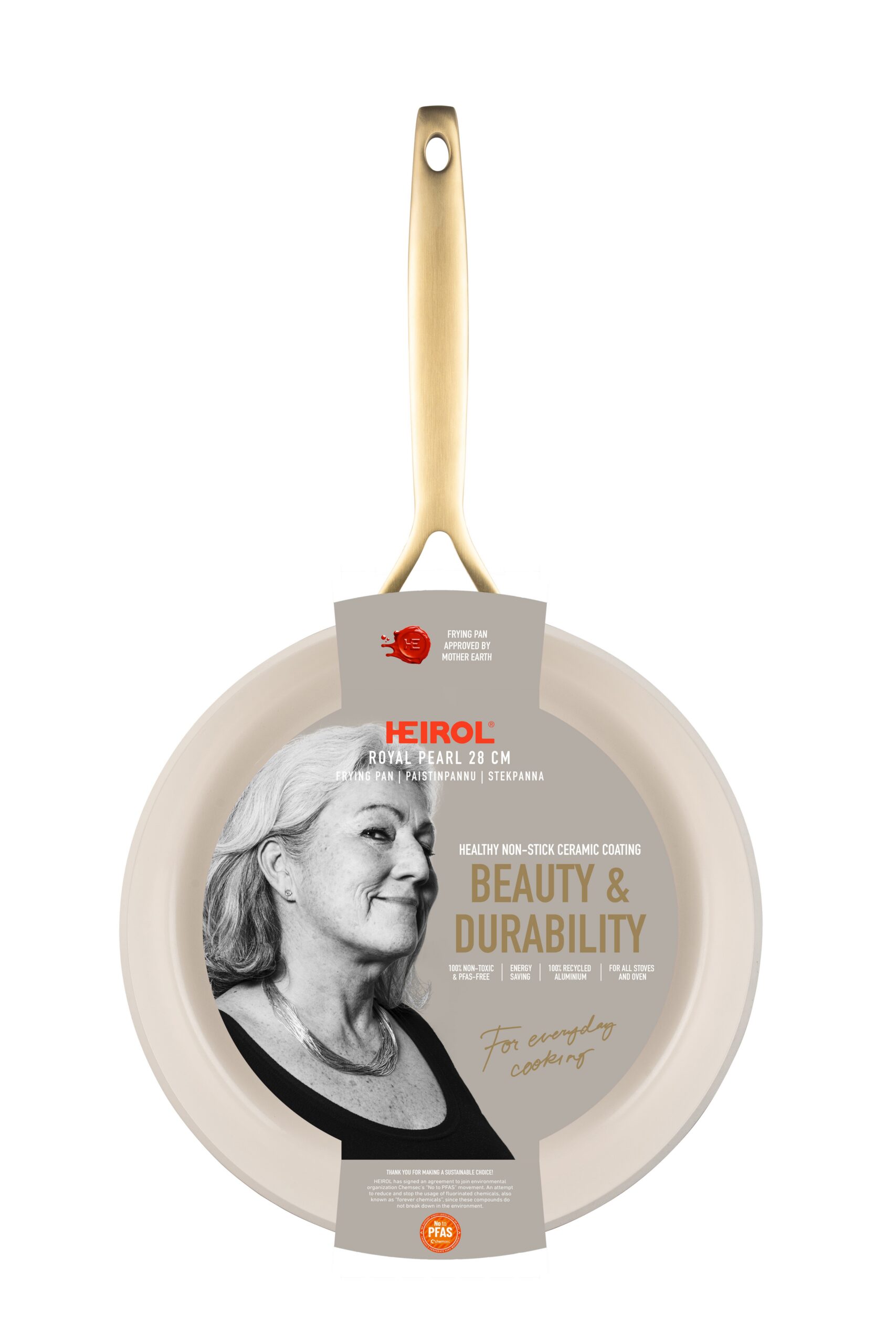 Küpseta ohutult Heirol Royal Pearl seeria praepannidega, mis on täiesti PFAS-vabad, mittetoksilised ja plastikuvabad. Stiilne ja praktiline Royal Pearl praepann on ideaalne valik igapäevaseks toiduvalmistamiseks. Royal Pearl seeria toodete kaunid pärlmuttertoonid ja mattkuldsed detailid on valmistatud 100% taaskasutatud alumiiniumist.
