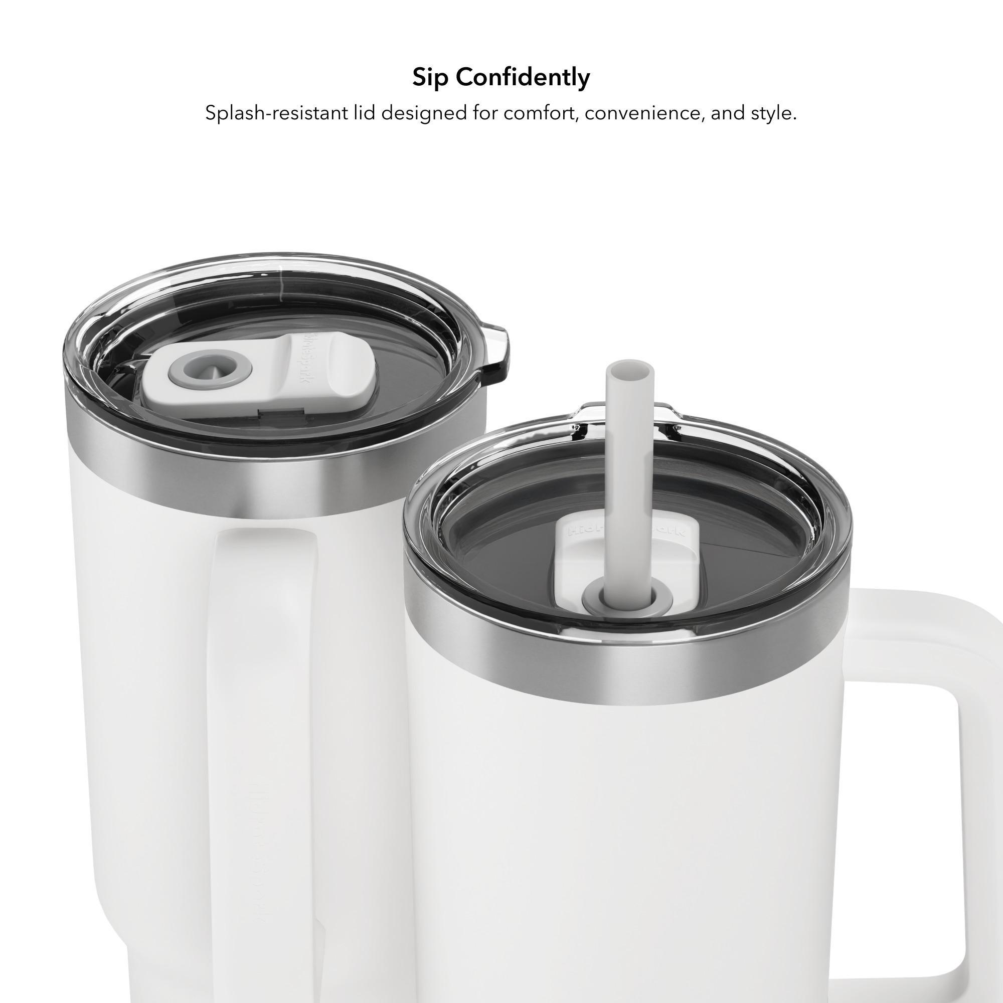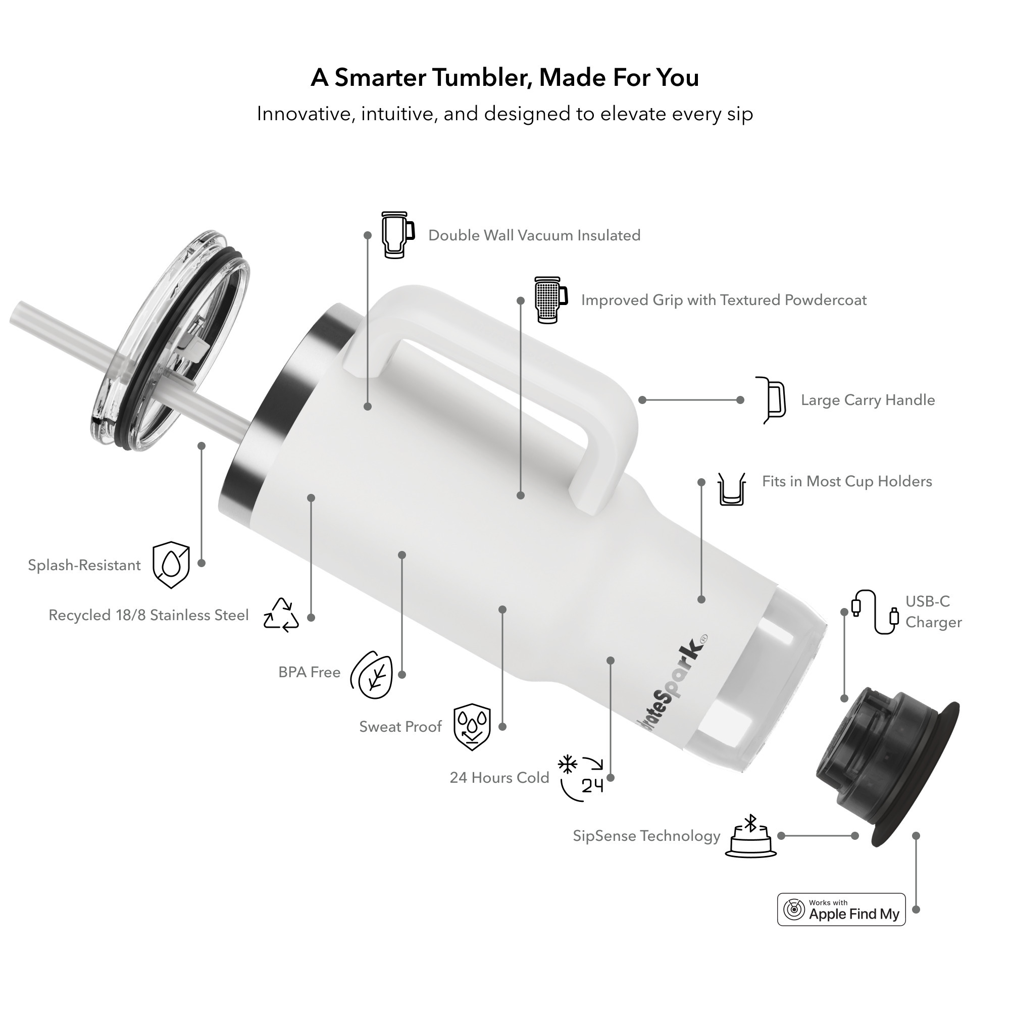 Tumblerissa on roiskeenkestävä press‑in‑kansi, jossa on sekä pillisuutin että juoma‑aukko. Ergonominen kantokahva ja mukitelineeseen sopiva kapea pohja tekevät siitä helpon kuljettaa mukana. USB‑C‑ladattava sensori tarjoaa jopa 21 päivän akunkeston. Materiaalit ovat BPA‑vapaita ja lyijyttömiä.