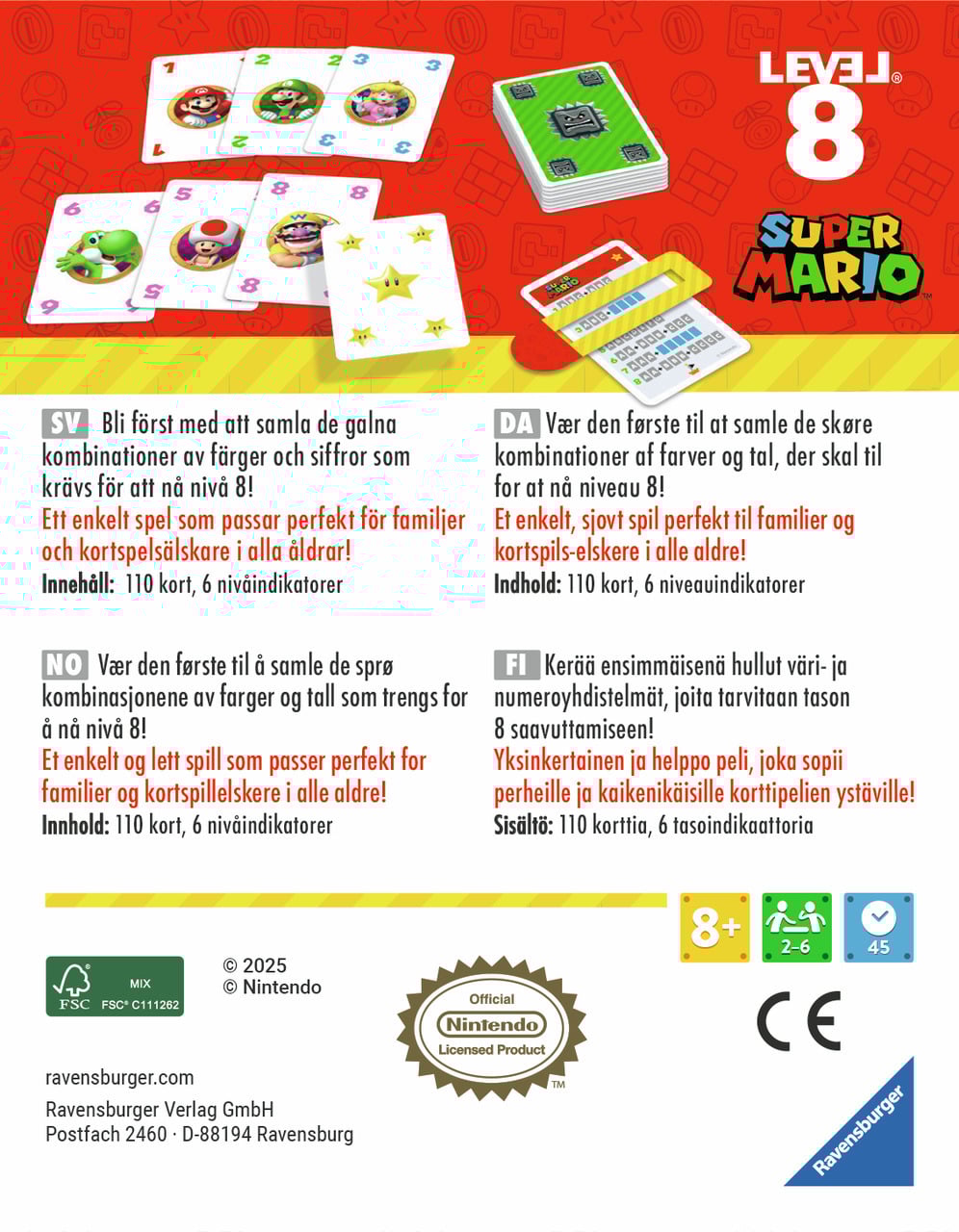 Super Mario 8. taseme kaardimäng toob Mario maailma tegelased põnevasse kaardimängu! Mängige tasemelt tasemele võiduni, korraldades numbrijadasid ja leides sobivaid kaarte. Lõbus peremäng 2-6 mängijale (8+) tuttavate Super Mario tegelastega!