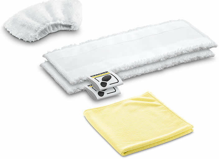 2 põrandalappi, mis sobivad EasyFix otsikuga, kare lapp katlakivi ja seebijääkide jaoks käsiotsikuga ning mikrokiudpoleerimislapp siledate pindade, näiteks peeglite jaoks.