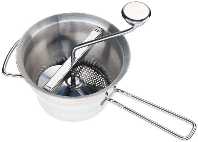 Purusta sügisese saagi puruks! Küchenprofi püreeveskiga on kaasas neli erineva suurusega vahetustera (1,3 mm; 2 mm; 3 mm; 5 mm). Veski saab kausi serva vastu hästi toetada, mis teeb püreestamise lihtsamaks. Püreeveskiga saate värsketest koostisosadest vaevata valmistada puuviljapüreesid, kartulipüreed ja beebitoitu. Toode on valmistatud roostevabast terasest ja seda võib pesta nõudepesumasinas.
