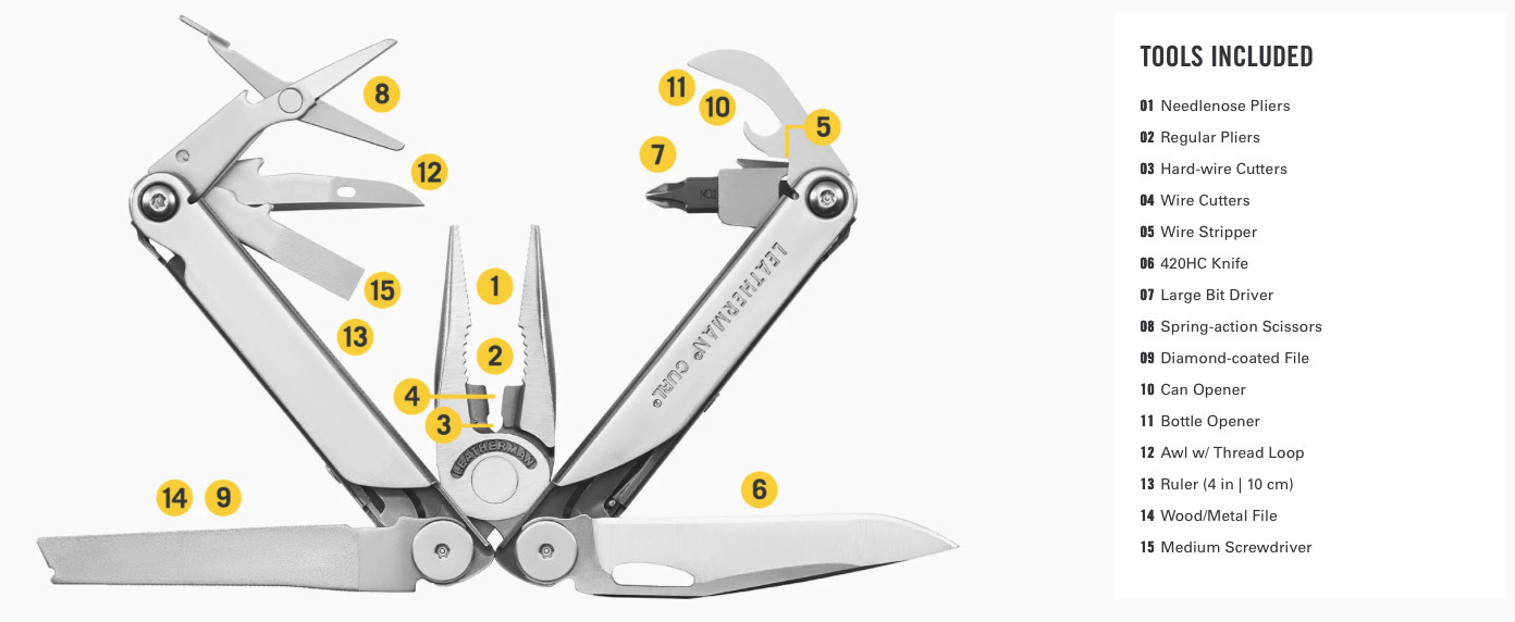 Leatherman Curl sisaldab 15 tööriista, sealhulgas teravat nuga, vedruga käärid ja vahetatava otsaga adapterit. Tööriist on kompaktne, vastupidav ja kaalub 212 grammi.
