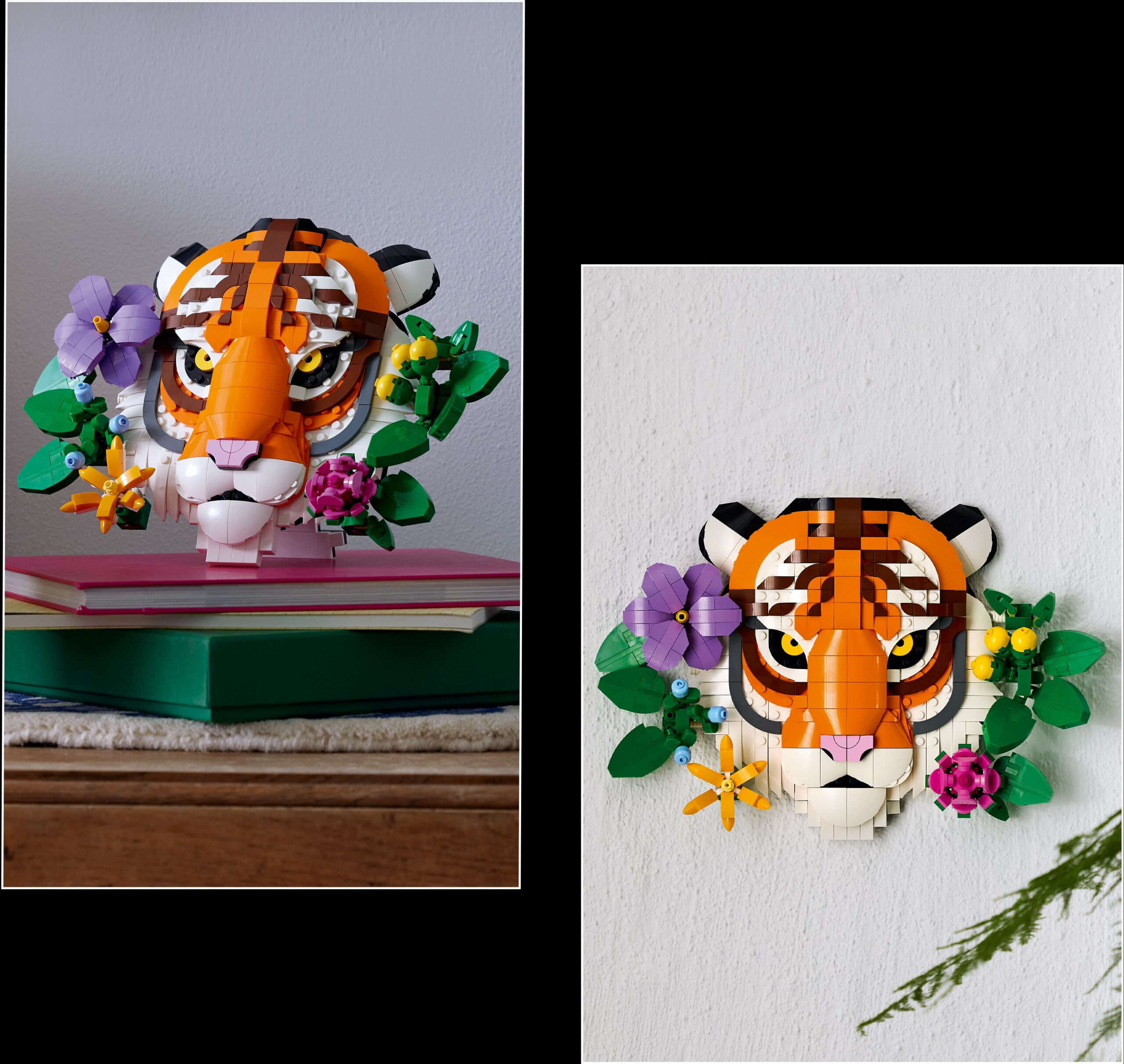 See täiskasvanutele mõeldud LEGO kunsti ehituskomplekt ehitab tiigripea, mis piilub dekoratiivsete lillede ja taimestiku vahelt välja.
