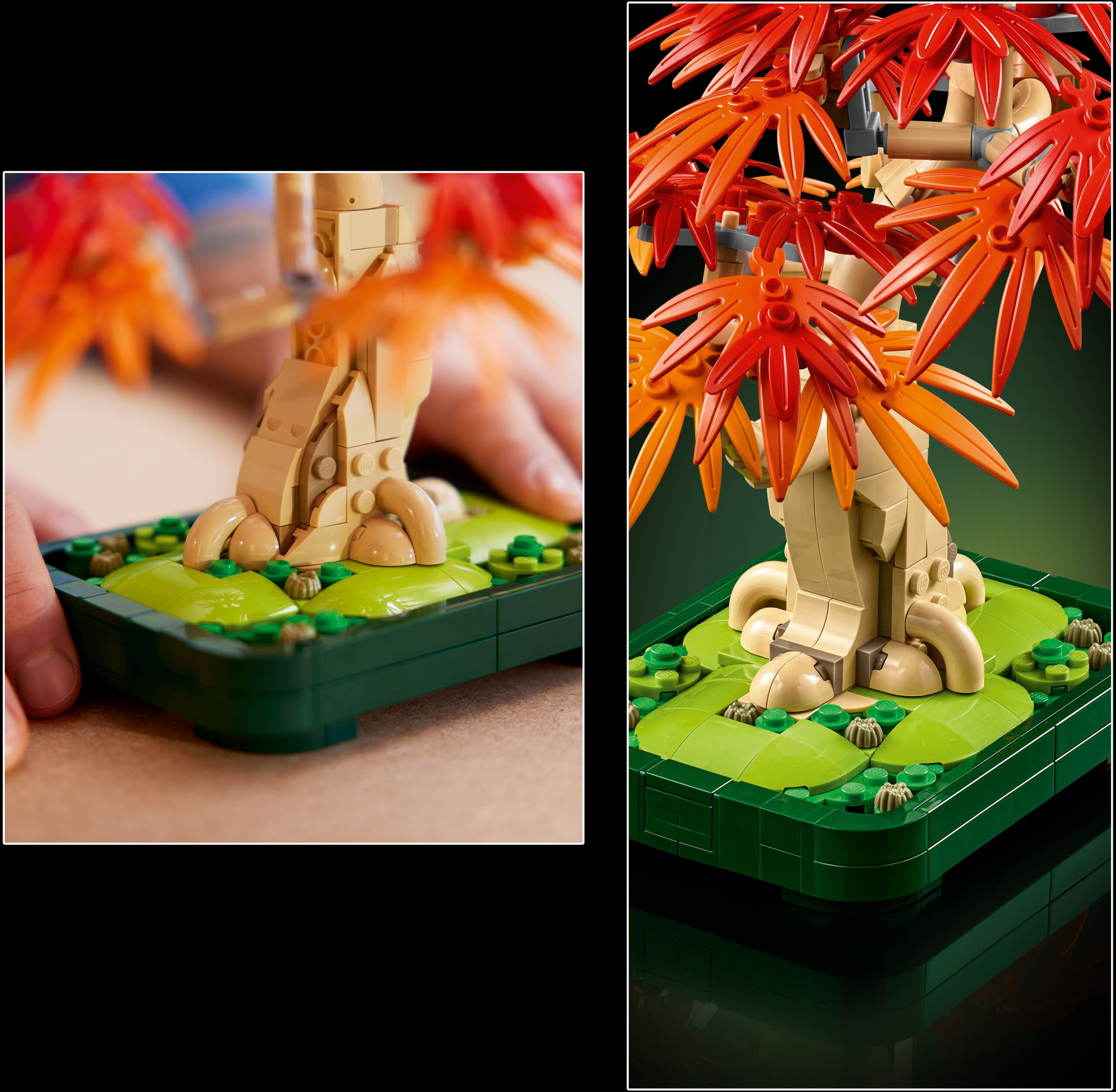 Ehita LEGO Botanicals punase lehe jaapani vahtra bonsai puu täiskasvanutele mõeldud komplektiga taimekaunistus, mis õhkub rahu ja tasakaalu.