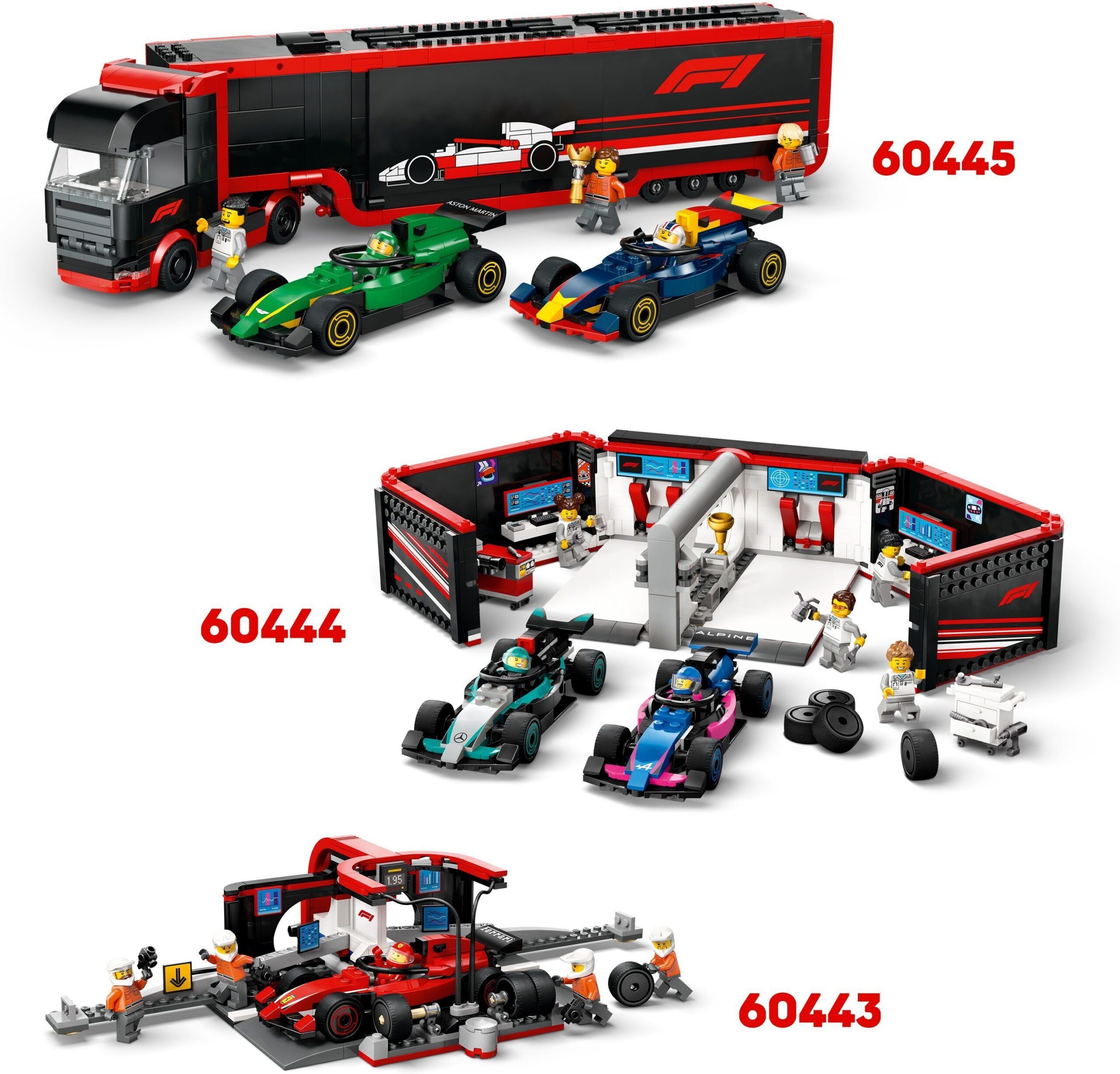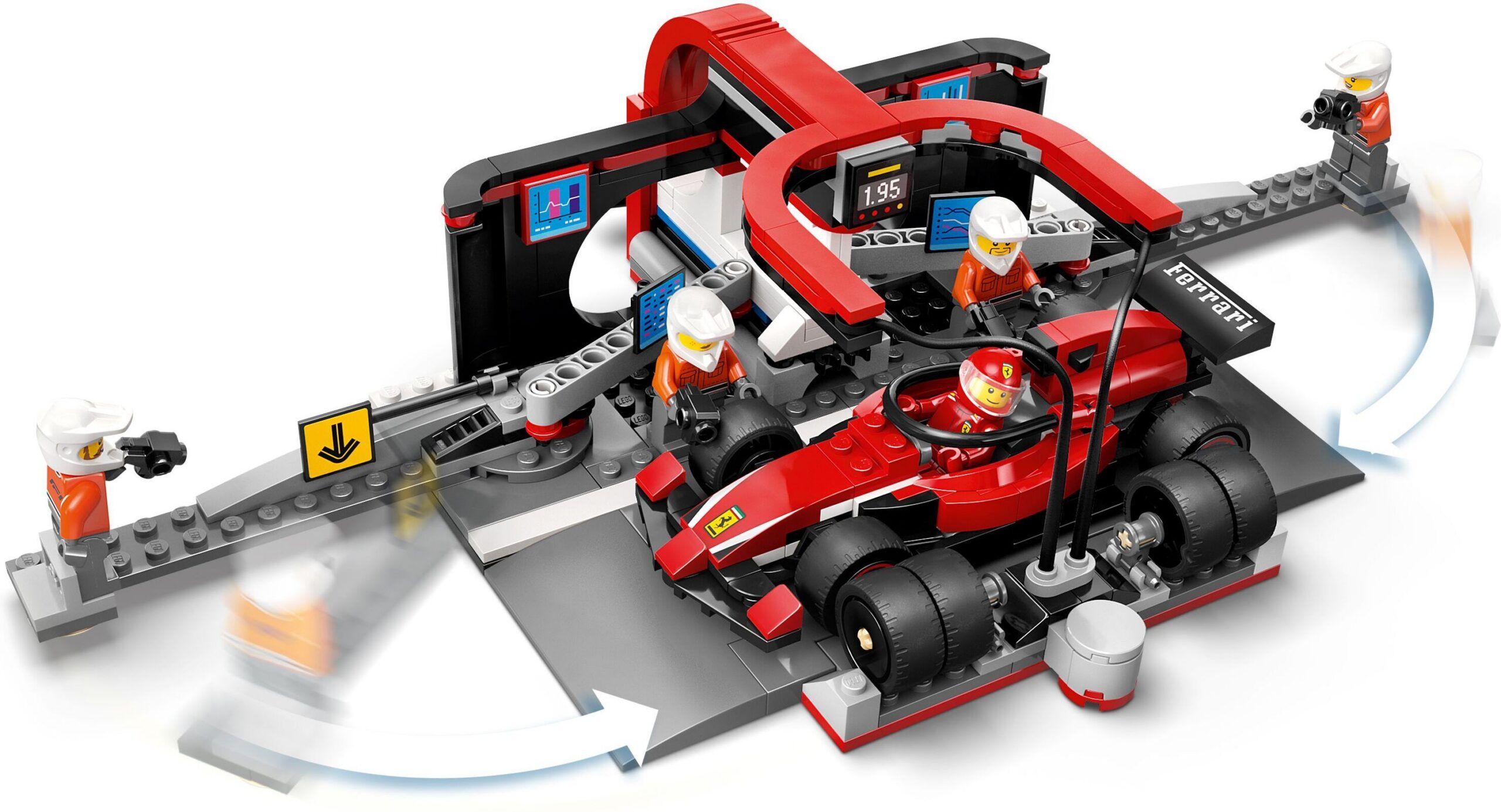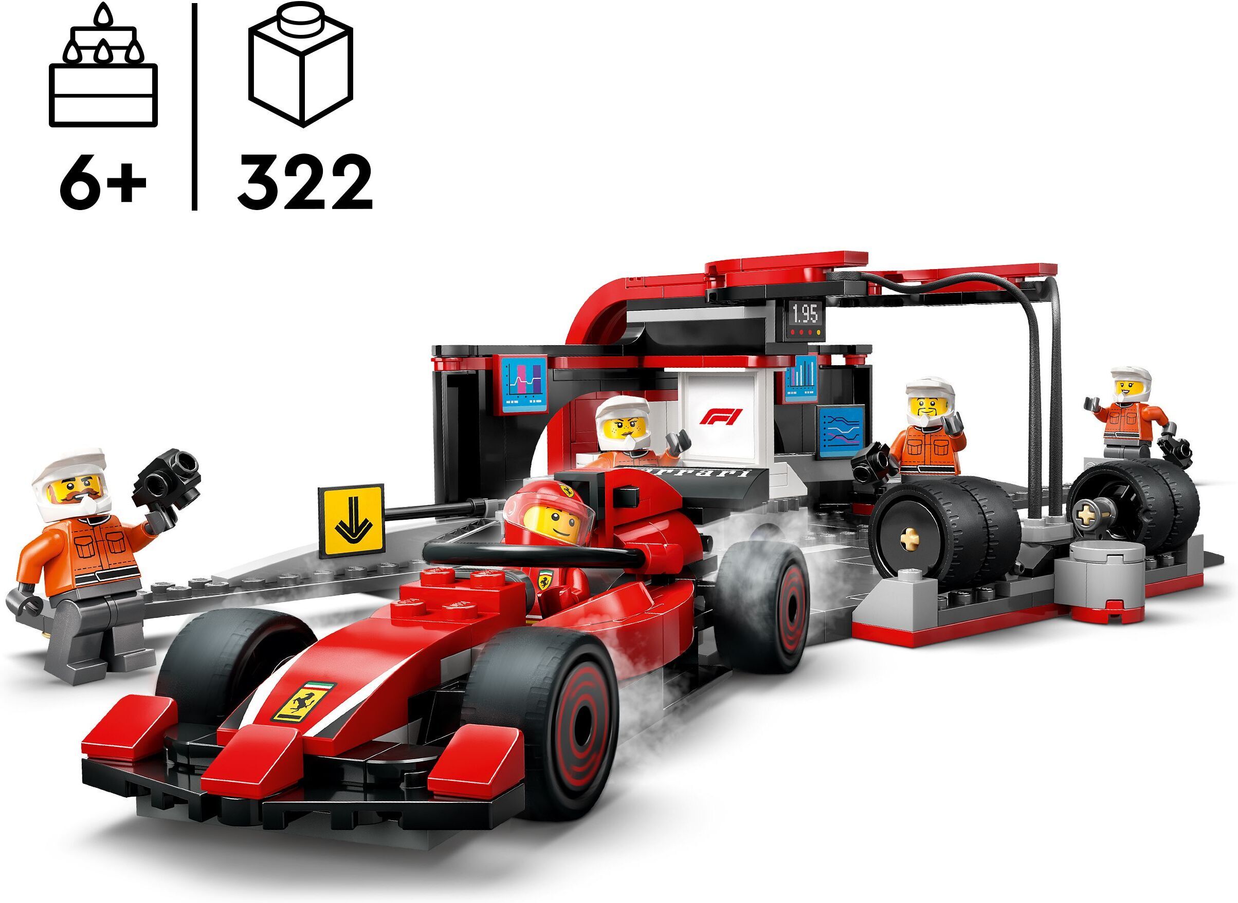 LEGO City F1 komplekt inspireerib Ferrari meeskonda rehve kiiresti vahetama. Komplektis on F1 boksihoone, boksimeeskond ja Ferrari võidusõiduauto.