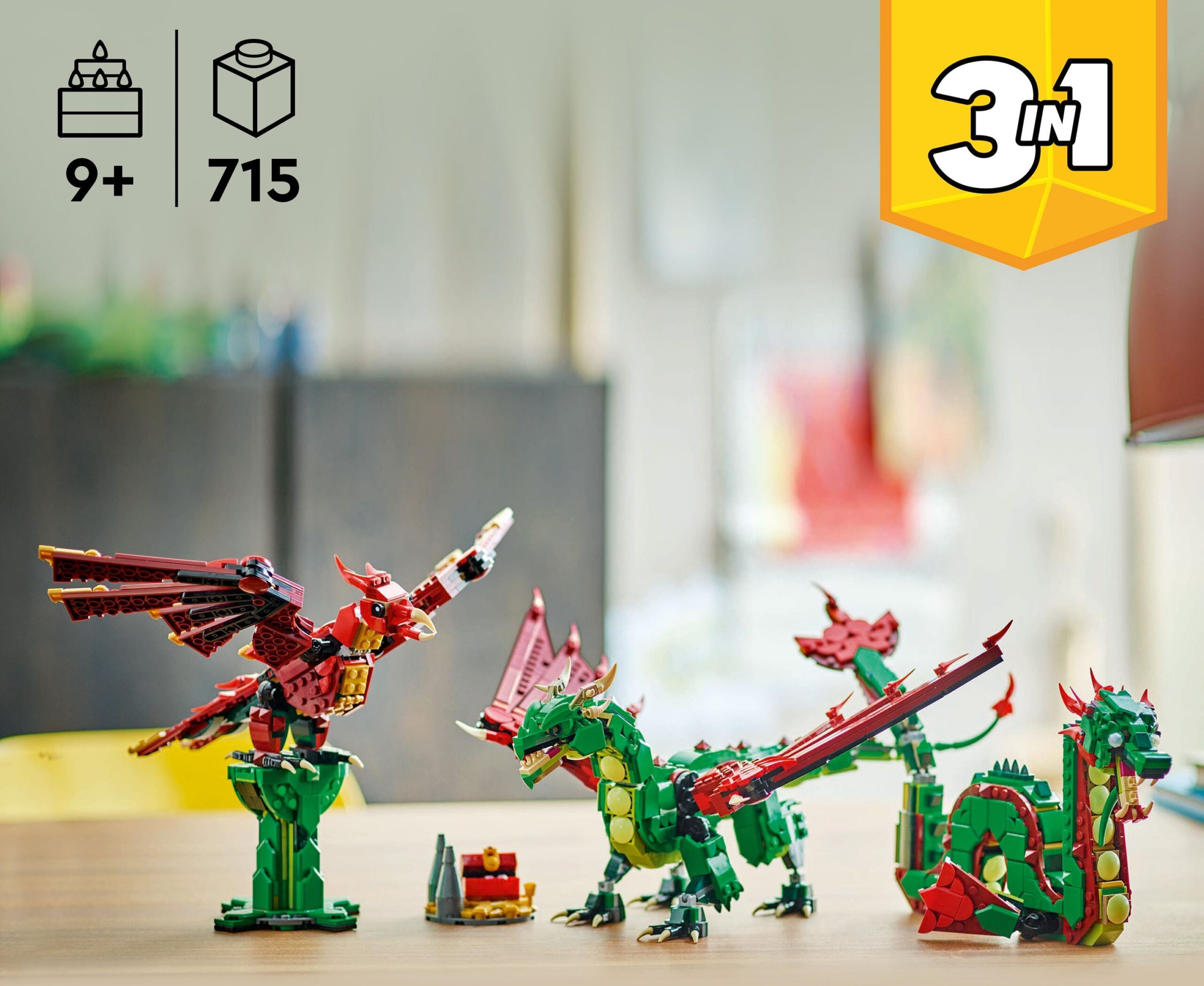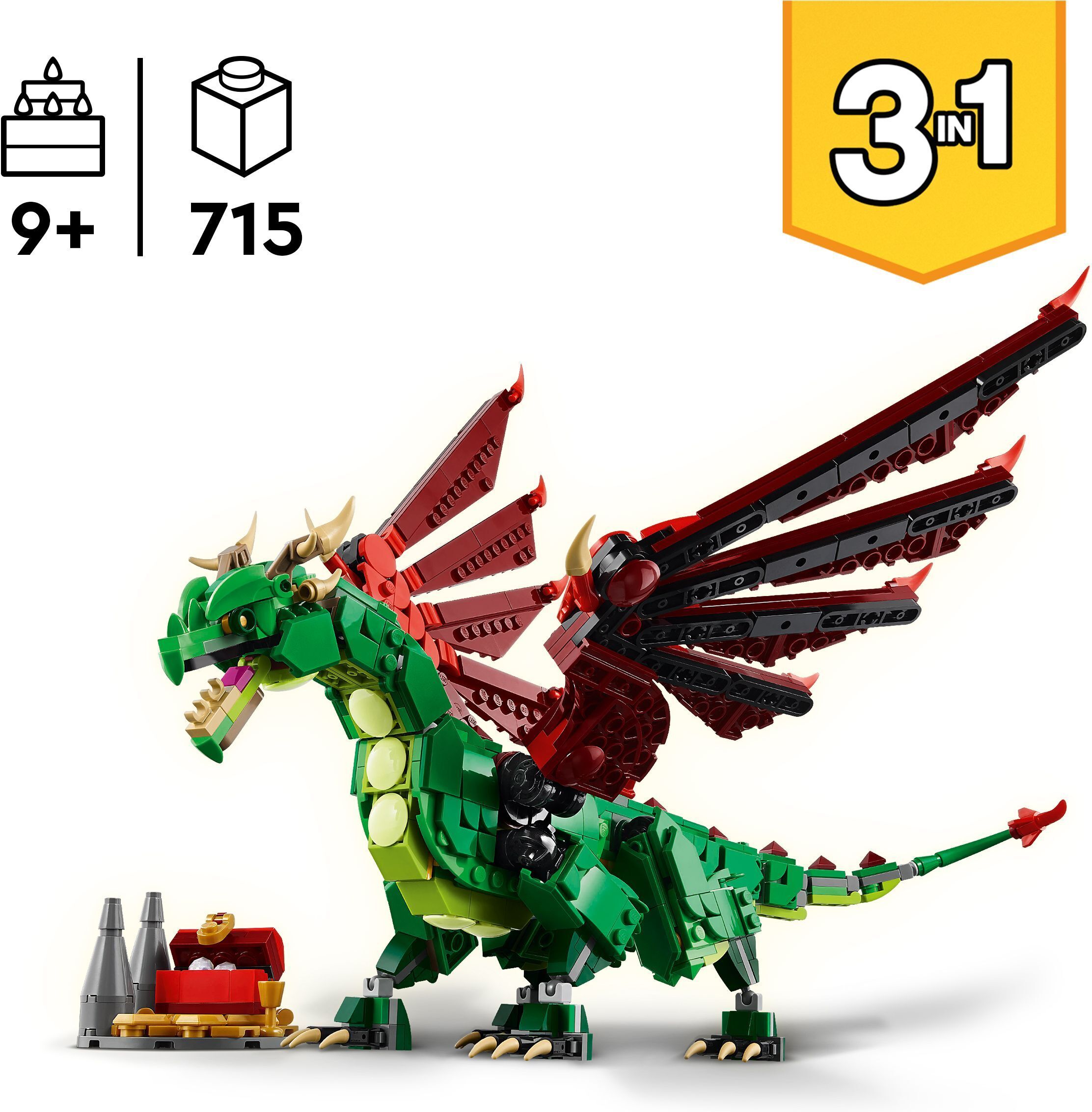 - 3 keskaegset müütilist olendit 1 komplektis – LEGO Creator 3in1 keskaegse draakoni komplekti klotsid võimaldavad 9-aastastel ja vanematel poistel ja tüdrukutel ehitada 3 erinevat loomafiguuri.