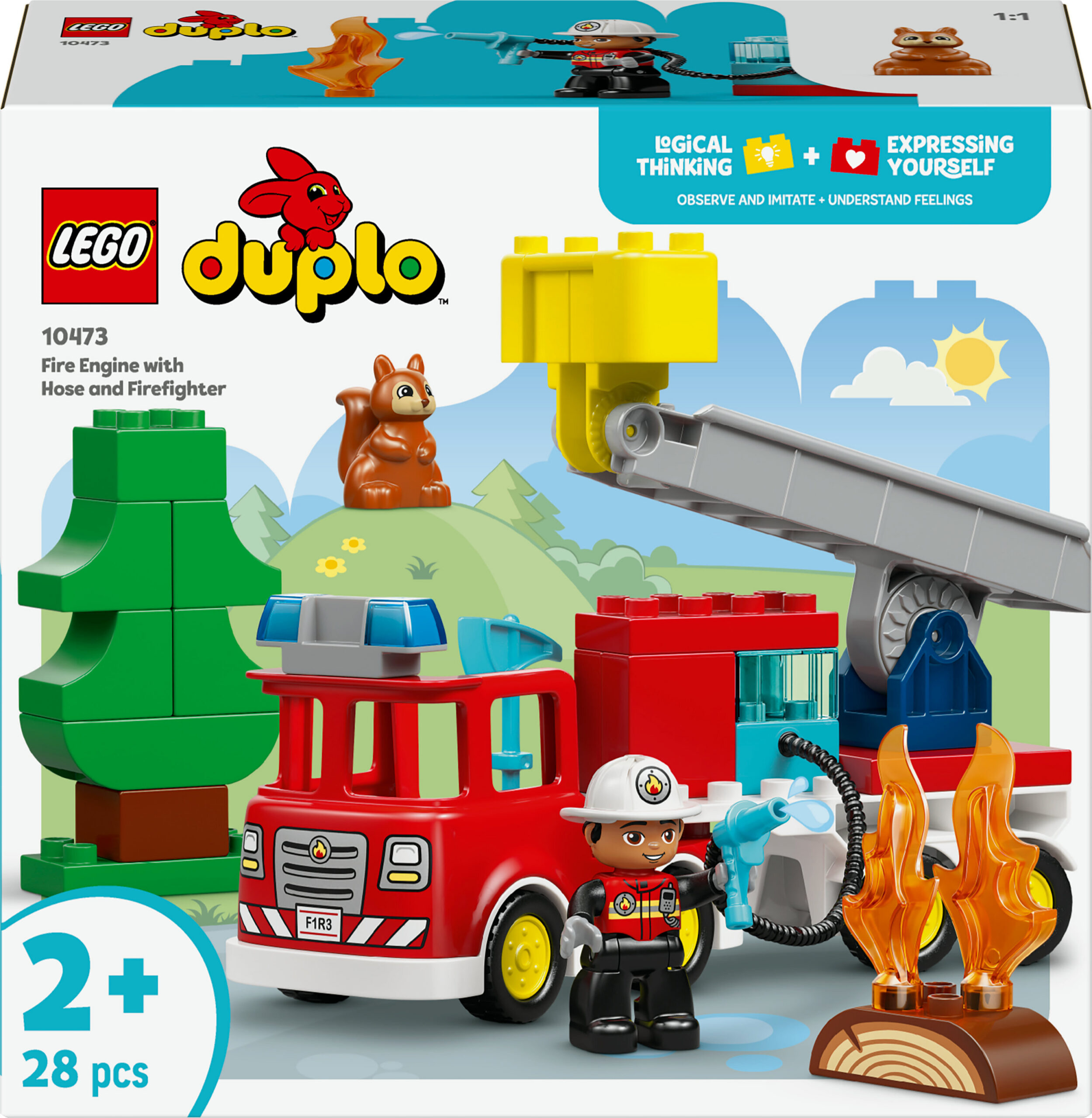 LEGO® DUPLO® Kaupunki Paloauto, paloletku ja pelastaja setti (10473) innostaa yli 2-vuotiaita lapsia mielikuvitusleikkeihin. Paloautosetissä on monia hauskoja ominaisuuksia, kuten taipuisa letku, puu ja LEGO DUPLO oravahahmo.