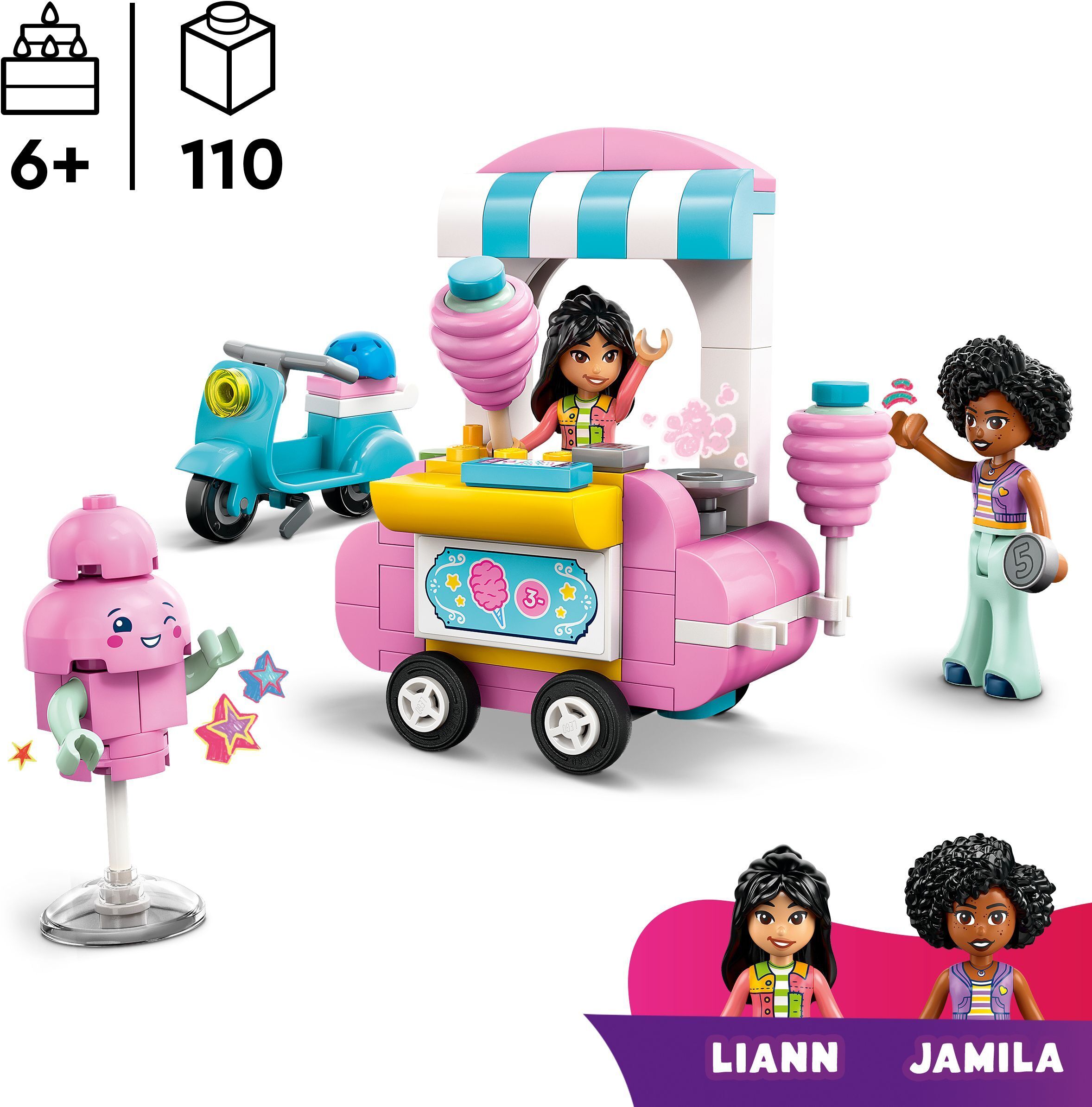 See komplekt inspireerib tüdrukuid, poisse ja väikeseid ehitajaid loovalt mängima ja oma lugusid jutustama. Liannile ja Jamilale meeldib suhkruvatipoes koos aega veeta. Kinnitage mobiilne käru LEGO mängukomplekti külge ja manage kausis välja suhkruvati maiustusi. Kaunistage suhkruvatt. Komplektis on ka kassaaparaat ja mänguraha ostlemiseks ja rollimängudeks.