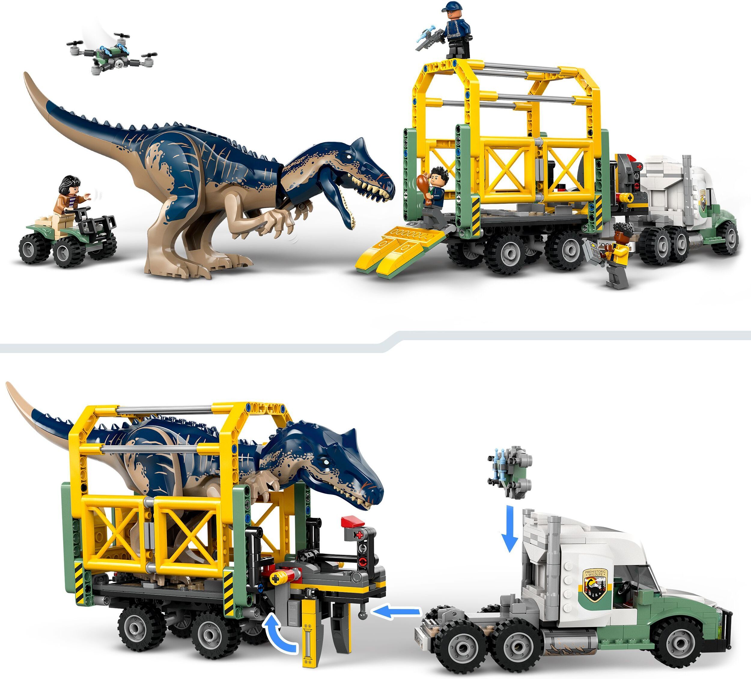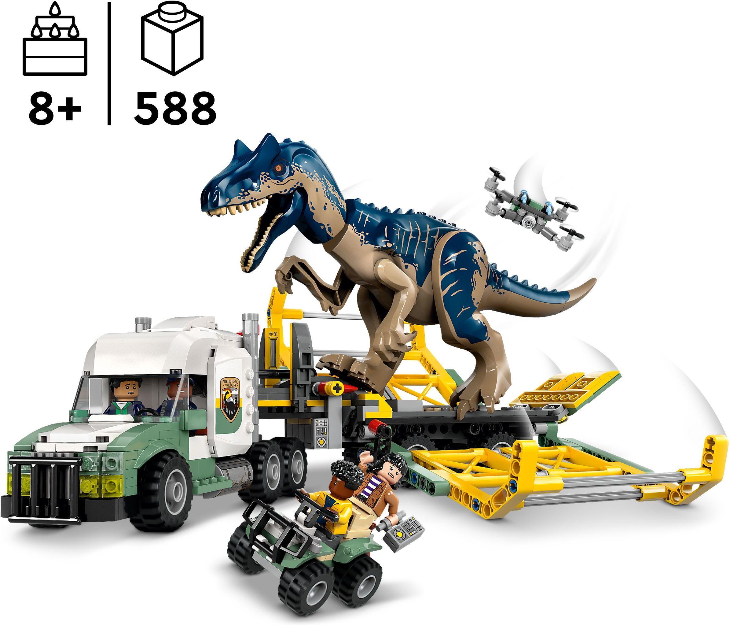 Uued ja ootamatud seiklused ootavad dinosaurusefänne alates 8. eluaastast komplektiga „Dinosaur Operations: Allosaurus Truck“ (76966), mis on täis mänguideid. See LEGO® Jurassic Worldi dinosauruse mänguasjakomplekt on lõbus kingitus laste pidudeks. See võimaldab lastel luua lõputult lugusid täis seiklusi Allosaurusega. Dinosaurusel on liikuvad jalad ja pea ning avanev suu. See sisaldab ka minifiguuridena Dariust, Kenjit, Yazi ja valvurit. Veoautol on avatav katus ja varikatus, 3 minifiguurile mõeldud kokpit voodiga, haagis esitoega, avatav tagumine kaldtee, kangiga avatav transpordipuur, lisaks ATV, droon ja palju erinevaid osi lugude inspireerimiseks.