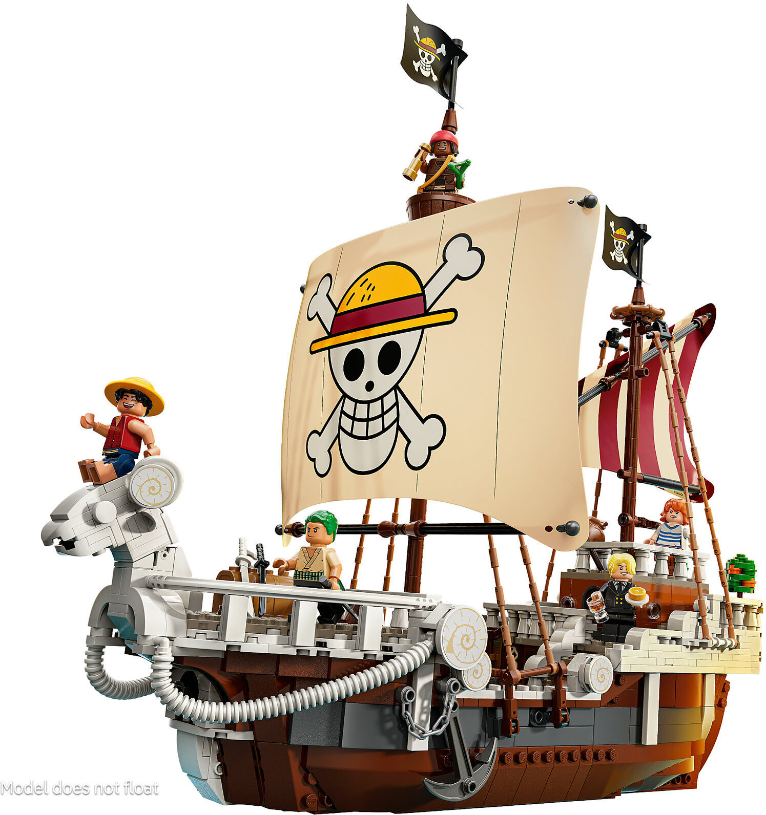 Legendaarisen laivan sisältä löytyy vaikka mitä! Kurkista miehistön hyttiin, keittiöön, varastotilaan ja tarvikepajaan. Setti sisältää 5 LEGO ONE PIECE minihahmoa. Luffy istua nököttää pässiä esittävän keulakuvan päällä laivan etuosassa – keulakuvan alapuolella on tykki. Zoro rentoutuu ja harjoittelee laivan kannella. Nami ohjaa peräsintä laivan takaosassa, jossa kasvaa hänelle mieluisia mandariinipuita. Usopp kiipeää vartioon maston märssykoriin, ja Sanji kantaa padat portaita pitkin alas keittiöön. Mukana on myös 4 ”Wanted”-kylttiä. LEGO Builder sovelluksessa lapset voivat zoomata ja kiertää malleja 3D-näkymässä sekä seurata edistymistä. Setissä on 1 376 osaa.